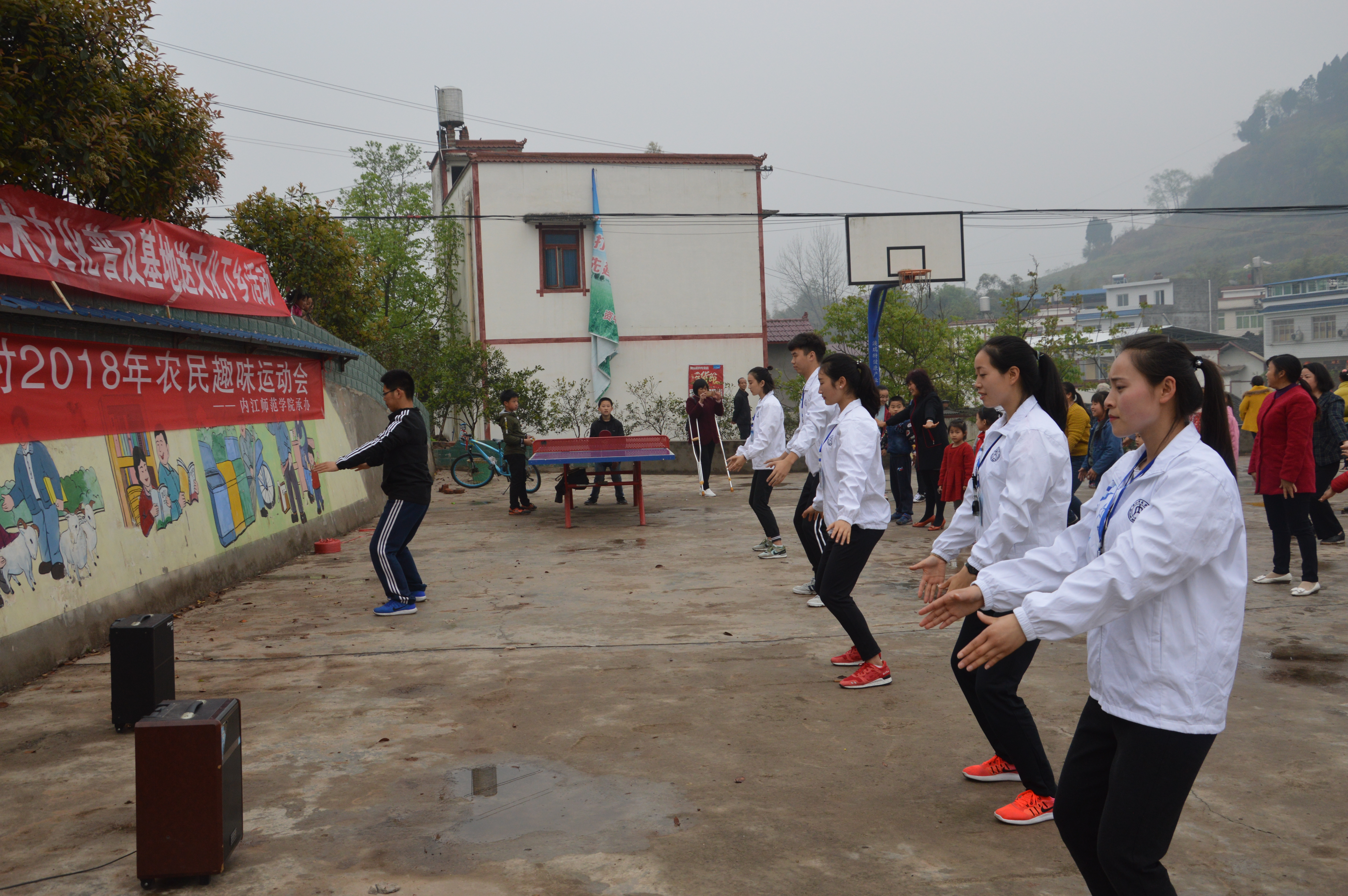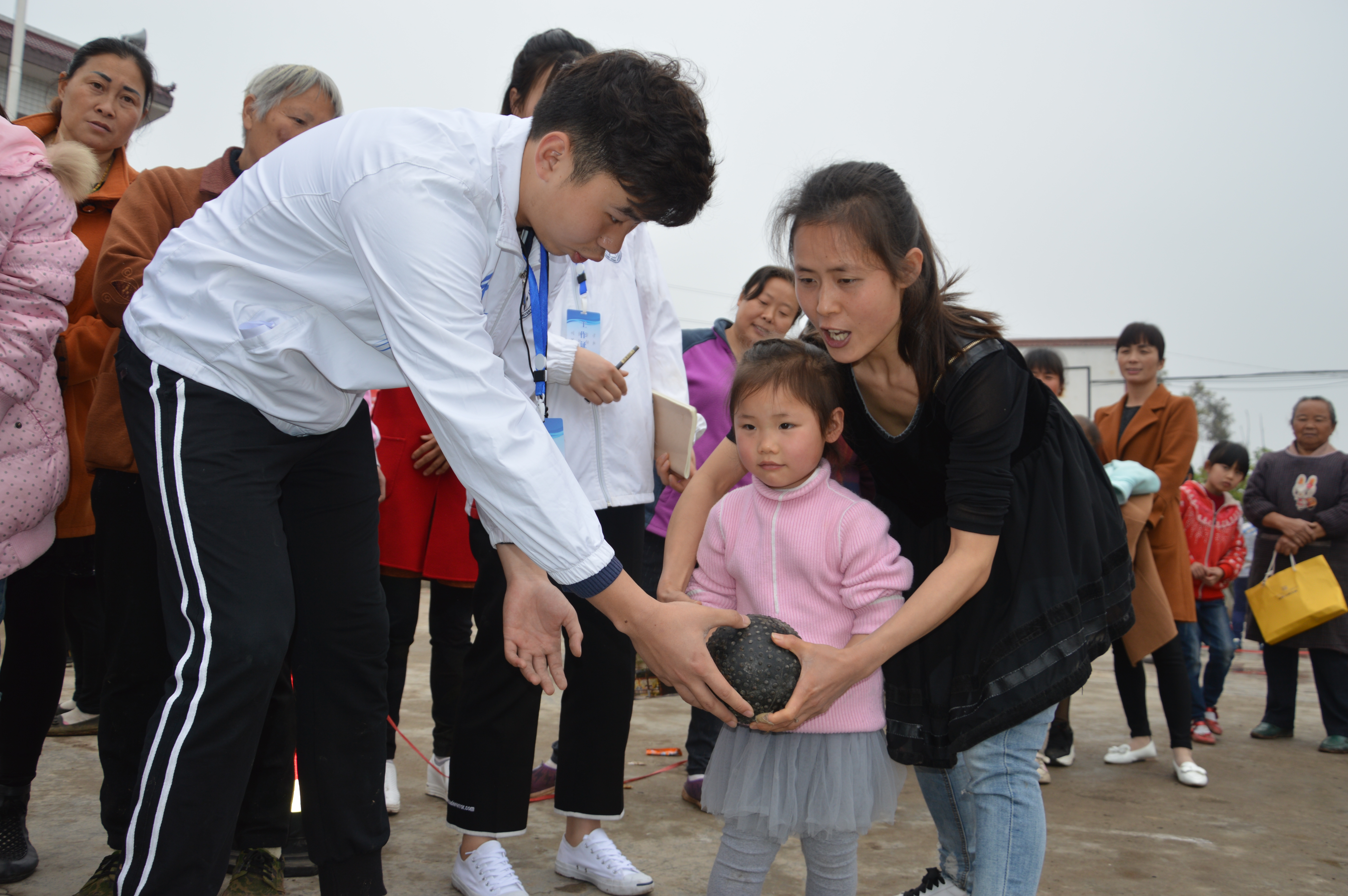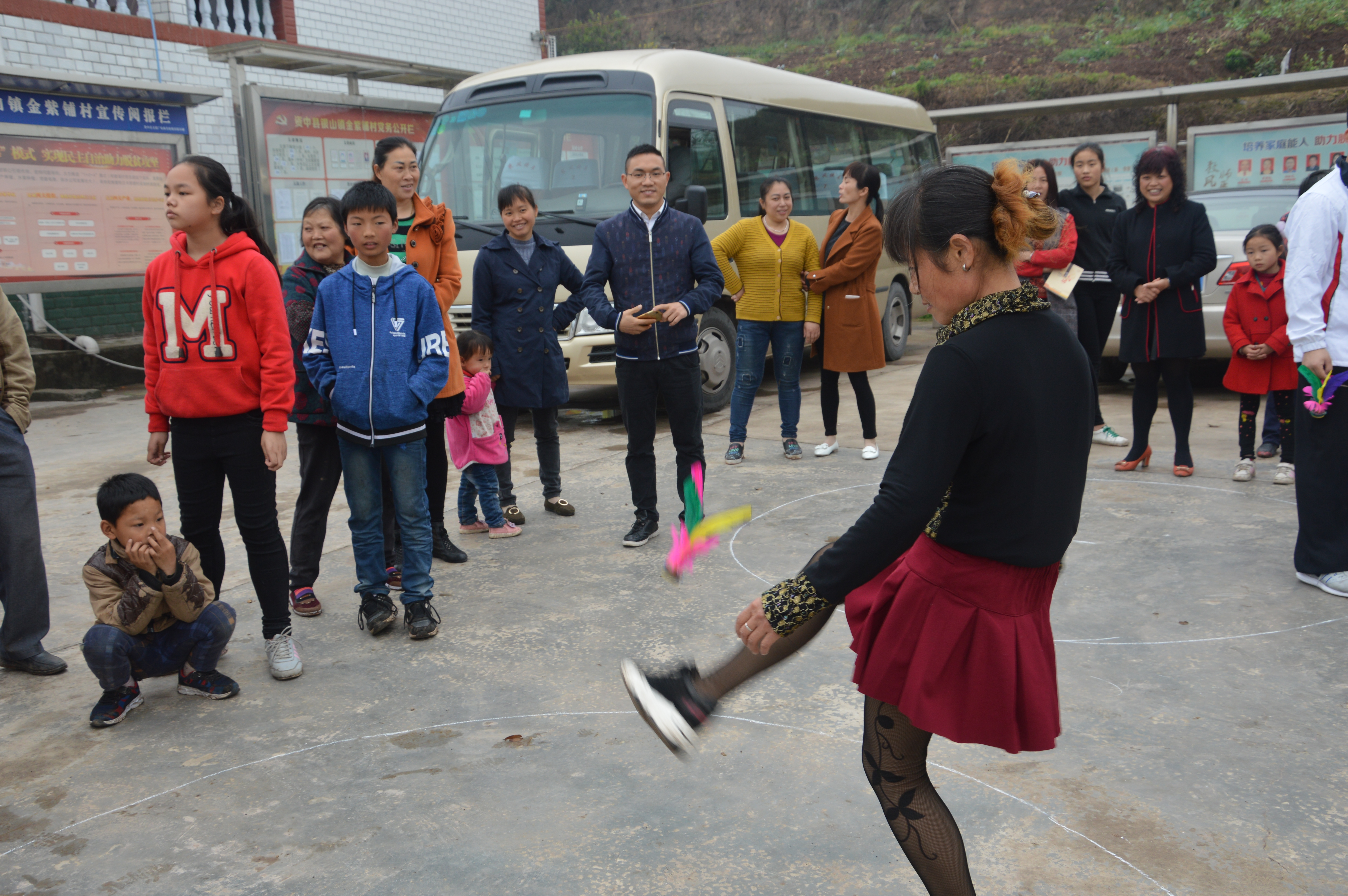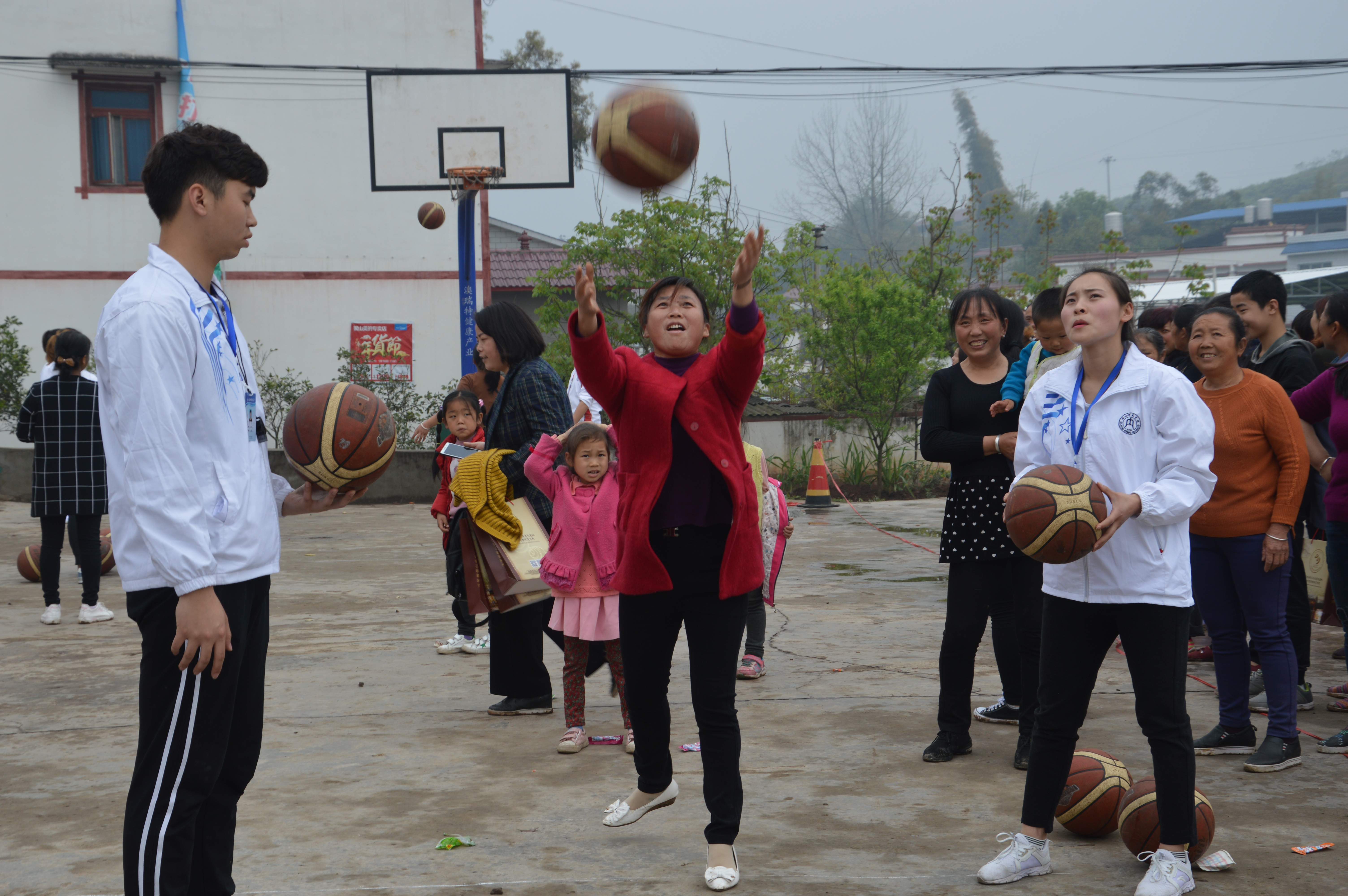 仪式结束,活动第三项:趣味运动会。首先进行的是踢毽子和跳绳比赛。许多家长都参加了踢毽子比赛,重拾童年记忆。接下来进行的是保龄球比赛,由家长带领小朋友一同参加,在比赛过程中,家长与小朋友协同合作有效的增进了感情,场面既祥和又激烈。最后一项比赛是定点投篮,参加的不仅有小朋友,同时也有很多家长也参加了,有家长提到,此前连篮球都没有碰过,借此机会感受一下。比赛有条不紊的进行着,村民们的热情丝毫不减。