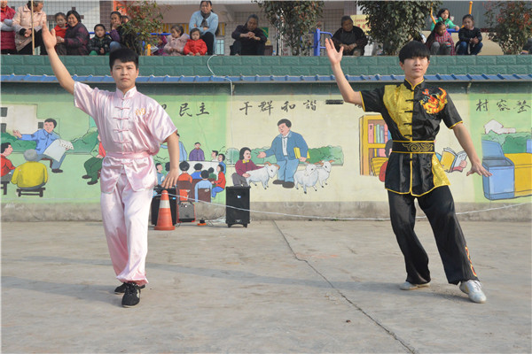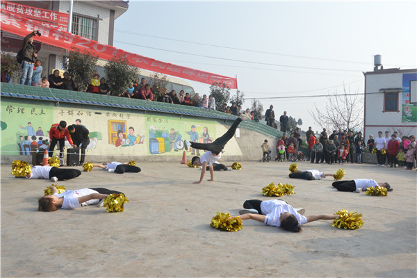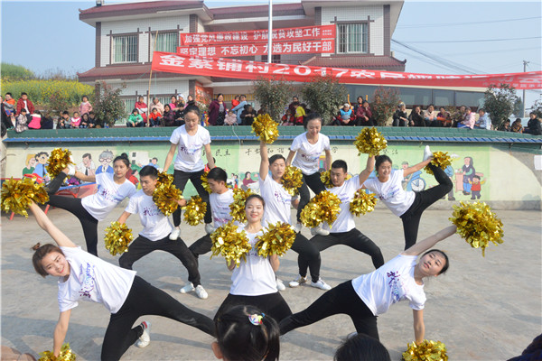 春风十里,天朗气清。上午9点,运动会拉开帷幕。同学们为乡亲们带来了刚柔并济的盘破门武术表演和活力迸发的健美操表演,随着《向快乐出发》动感节奏的响起,现场的气氛也被调动了起来。随后,金紫铺村的村民跳起了广场舞《拉萨夜雨》,她们用脸上的笑容展示了对脱贫攻坚、创建“四好”的决心与信心。
