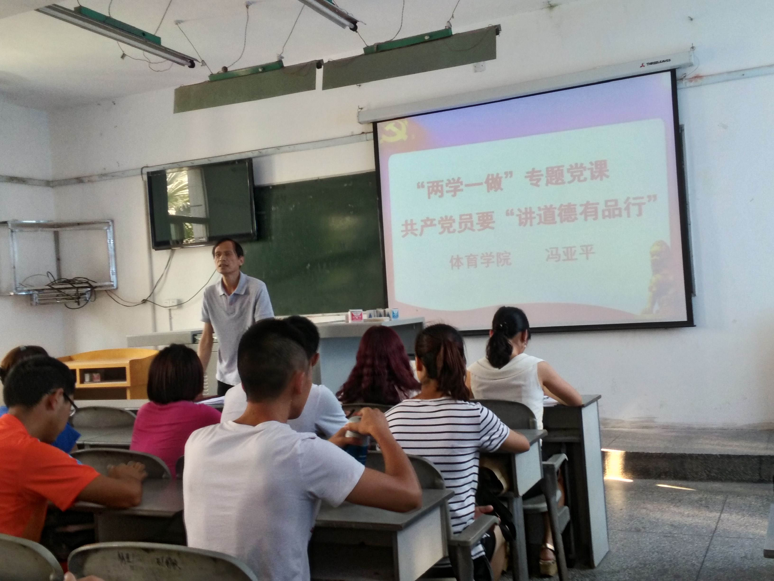 冯书记围绕“两学一做”,以共产党员要“讲道德有品行”为主题,首先强调做合格党员,要坚持明大德、守公德才能永保党的先进性和纯洁性,接着从三个方面重点阐释了“讲道德有品行”的具体内涵。第一,“讲道德有品行”要求我们做人要实,光明磊落,要忠诚老实,品行一致,做老实人,说老实话,干老实事。做老实人就是要忠诚面对党、面对人民、面对同志;说老实话就是对自己的成绩不夸大,对自己的缺点不缩小,对自己的错误不欺瞒,做到言行一致,表里如一;干老实事就是要求每个党员都要对党和人民高度负责,以大局为重,要真诚对待自己的岗位,服从安排,在关心自己学习发展的同时还要关心周围的同志。第二,“讲道德有品行”要从小事上做起,从细节上加分。冯书记讲到“态度决定一切,细节决定成败”,每位同学都要自觉践行社会主义核心价值观,自觉修德、立德,守住做人、做事、交友的底线。第三,“讲道德有品行”关键在于能否正确处理好“公私”二字,如果“私”字当头,则不能成为一名合格的党员。作为党员要树立良好的服务意识和奉献精神,树立公与私,权与法的意识。