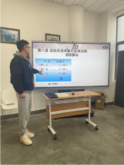 然后,邓意杭老师对运动员战术能力及其训练进行了讲解。首先讲解了经济战术与运动员战术能力,之后重点讲解了战术方案制定以及战术训练的方法和要求。经过教研室教师讨论后认为,邓意杭老师对课堂的掌控能力较好,仍然需要提高对课件内容的把控,加强与员工的互动,使课堂获得更好的效果。