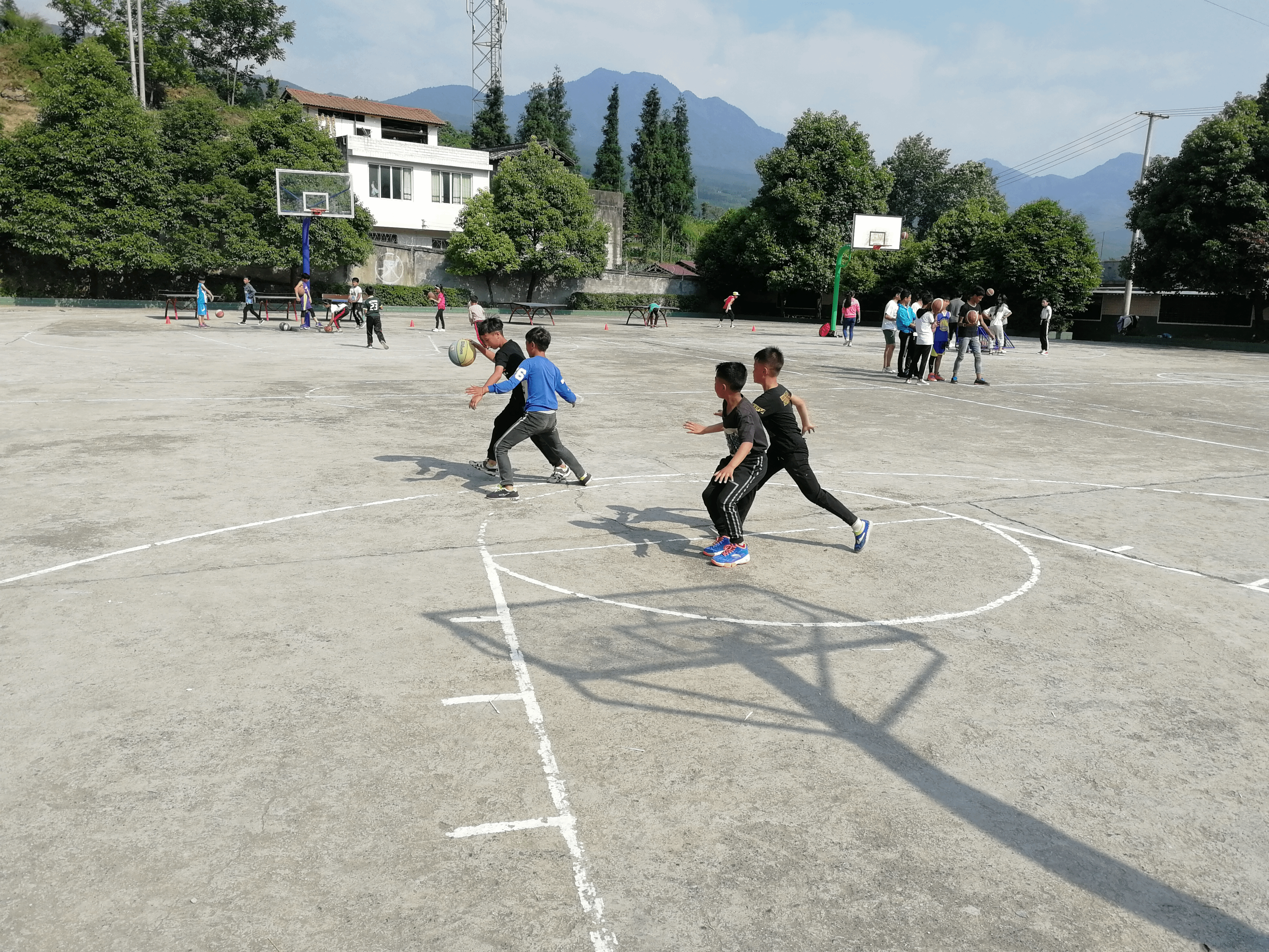 环境虽艰,仍然坚持。于乐山卷桥小学支教的志愿者许志愿说:支教的每天都过的很充实,要上体育课也要带球队训练。受训练场地限制,篮球场需要自己用石灰画,也让我掌握了一项新技能。下午太阳太大,我们就在车棚练习基本功,一天天坚持训练,风雨无阻.队员们虽然有时嘴上会说累,会抱怨太阳大,天气热,不过一旦进入到训练中便投入其中。