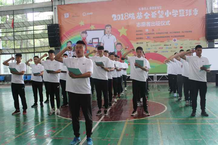 第一项议程:出征仪式上,李才宝书记首先介绍到:“姚基金希望小学篮球季”的理念是“以体育人,开启新希望”。告诫志愿者们在肩负责任的同时时刻牢记使命。据悉,时至2017年,姚基金篮球季已连续举办六年,与全国13所高等院校合作,累计派出1413人次的支教志愿者,使近720000人次的贫困地区青少年从中获益。