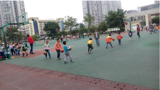 同学们到达内江六中正是早操大课间操,全校员工在三个不同的场地进行活动,人很多,但是秩序很好,见习老师对同学们的组织能力大为称赞。10:20,潘老师上高一篮球课,同学们开始看课 。老师教了左右手抛球、腰间绕球、原地胯下抛球等技术,之后男生自己练球,女生进行对篮球的初步认识。潘老师说:“对于没有接触过篮球的员工,要求太高,会降低她们学习篮球的兴趣,所以适当就好。”11:10,老师让见习的两位同学上高二篮球课,两位小老师非常认真,他们教了运球、双手抛球、弧线抛球等,深受同学们的喜爱。