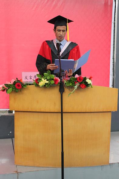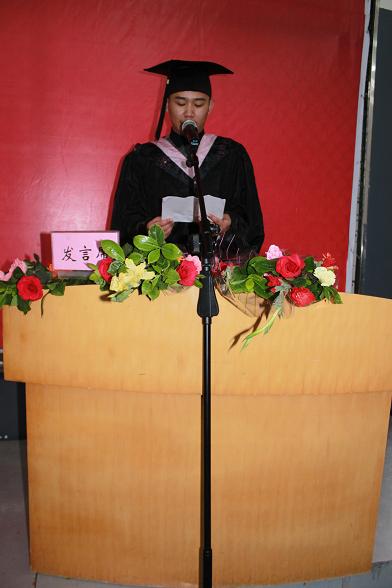 来自2008级1班的刁沛同学作为毕业生代表发言。他首先对四年来辛勤付出的全体教职工表达了自己最衷心的感谢和崇高的敬意,并表示在新的人生征途中要秉承“明德、博学、笃行、创新”的校训,继承和发扬母校的优良传统,勤于实践、创新进取,以更加优异的成绩回报社会,回报母校。在校生代表、2009级1班的唐菲璘,教师代表田径教研室老师胡谦分别发言,表达了对毕业生的惜别之情,并向他们送上了美好的祝福。