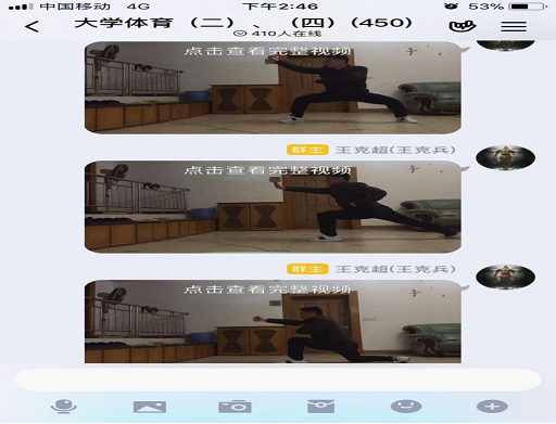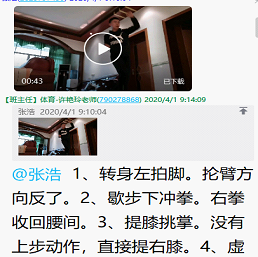 (2)在行课过程中,由于受器材、场地影响,无法将示范动作直观得展示给员工,所以在上课前提前录好教学视频并分段上传QQ群,以便让员工预习、学习复习预习。