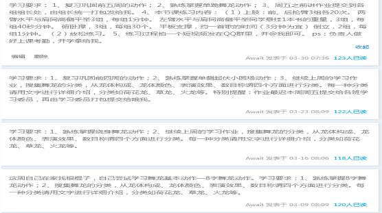 改进措施:针对存在的问题,尽量使员工掌握项目的基本知识、技能和技巧,采取了一些列行之有效的办法,进行教学和观测员工学习效果。一是简化学习内容,将学习内容进行改良在进行教学,如先让每位员工自己掌握好个人的单个的技术动作,器材选用棍子充当龙头、龙节和龙尾。二是通过布置训练作业并录制视频提交到学习群组进行评定,从而获得教学效果反馈。三是通过上课和下课时的学习打卡来考勤员工的学习状态和态度。