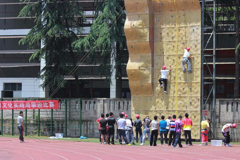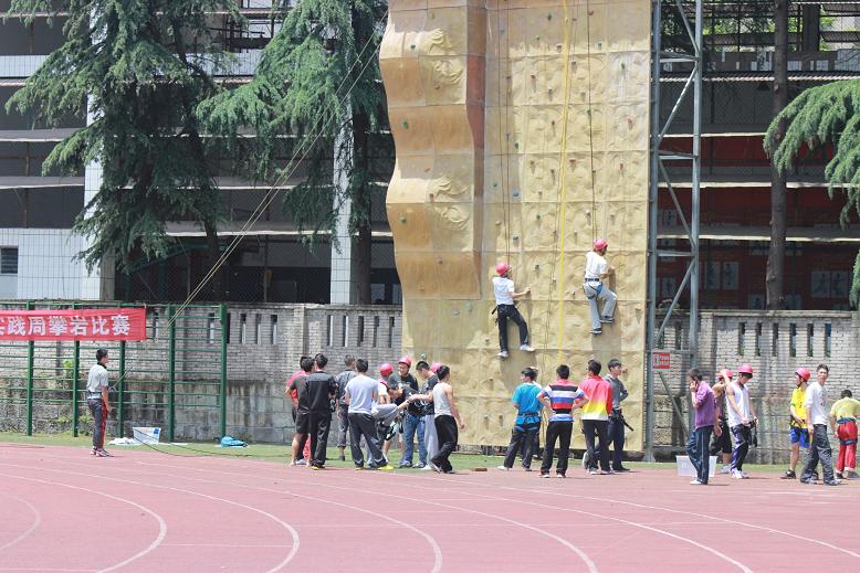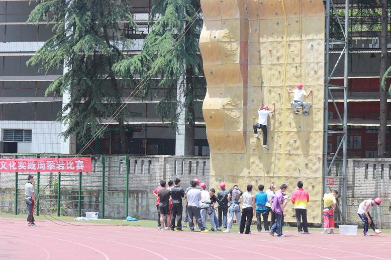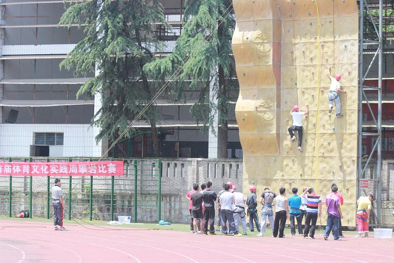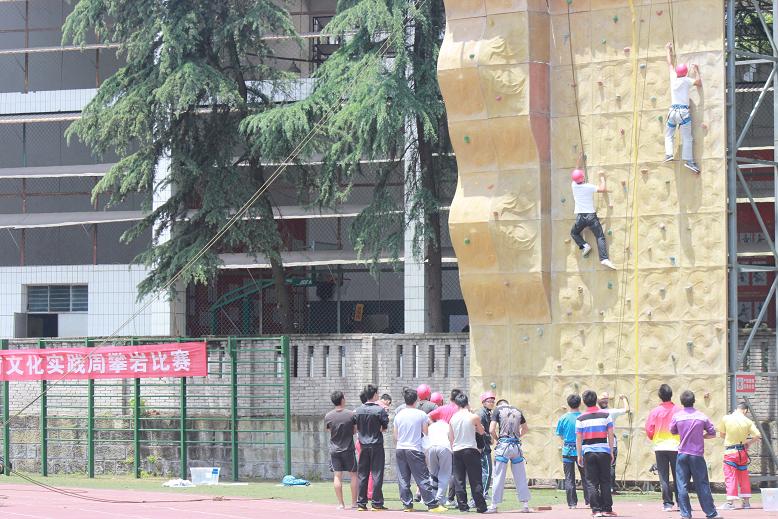 经过前期活动内容的有序组织及宣传,攀岩比赛活动于5月1日在西区田径场攀岩比赛场地进行比赛,进行比赛的项目是男子难度项目及男子速度项目的比赛,在比赛过程中有的参赛队员集中注意力,脚下全神灌注地踏着岩块,留意身体在岩块上位移的每个细节,有的参赛队员具有良好的柔韧性、节奏感及攀岩技巧,娴熟地在不同高度、不同角度的陡峭岩壁上轻松、准确地完成身体的腾挪、转体、跳跃、引体等惊险动作,给人以优美、流畅、刺激、力量的感受。有的参赛队员在比赛中当支点间跨度较大时,上、下肢配合的非常协调舒展,盘眼有节奏,上拉、下登都同时用力,身体重心落在脚上,保持面向岩壁、三点固定支撑、直立于岩壁、三点固定支撑、直立于岩壁上的攀登姿势。并且在攀登者上升过程中,保护人不断收绳,使攀登人胸前不留有余绳,更好的发挥出自己的水平往上爬。而在下方进行保护的同学在保护人收绳时,随时注意有一支手握住下降器后面的绳索、或把下降器两头的绳索抓在一起,给参赛队员们创造出了一个良好的比赛环境。