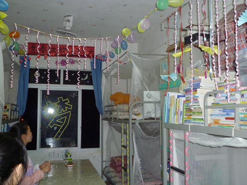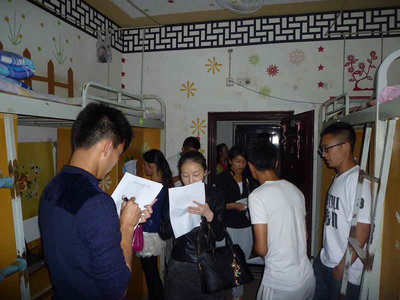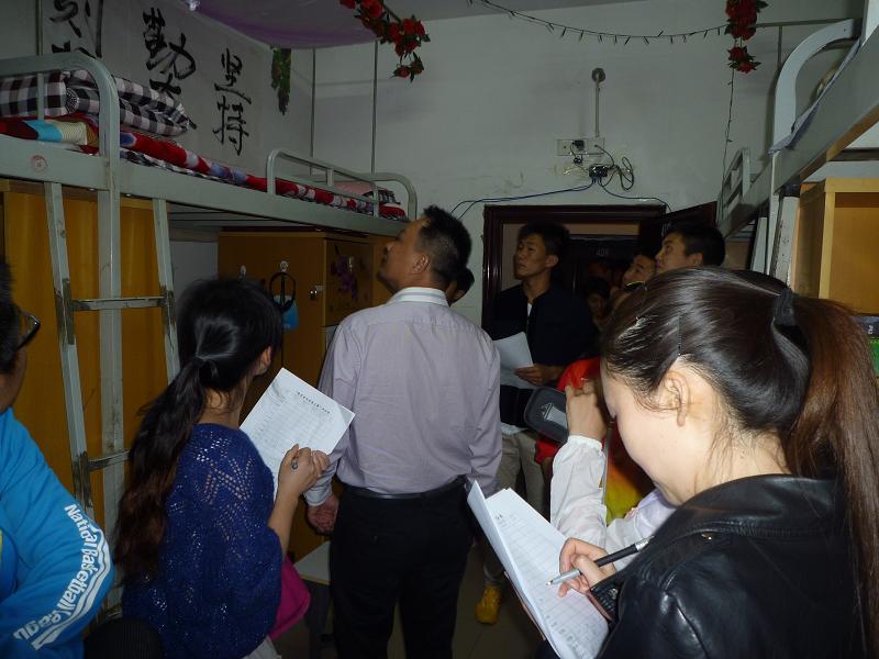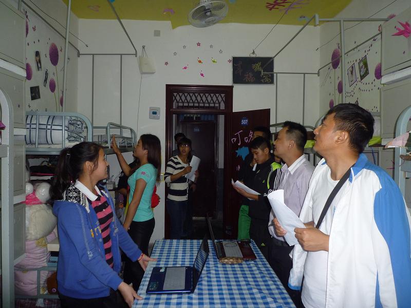 在进行寝室参观评比的过程中,每一间寝室都为老师、同学们带来不同的风格,各具特色,有贴上强纸的,在桌上摆放小花儿的,还有挂上字画的。多个寝室对门也进行了装扮,有贴上室画,有挂上室友动态,有贴对联等等都进行了精美的装饰。寝室的内部装饰有确定寝室装饰主题的,更是十分美丽。有海洋感觉的,有环保绿化的,有温馨舒适的;各个寝室能够在保持寝室整洁干净的基础上,还都装饰的十分漂亮,虽然寝室原本的大小布局不同,但同学们都进行了各具特色的装扮,有的凸显了浓厚的文化气息,有的展现了室友的情谊,有的展现了青春飞扬的主题,有的带有艺术气息,有的则带有古老气息;在询问她们关于自己宿舍文化的构想和心思时;寝室解说人员解说流利得当,能突出介绍寝室重点、特色;