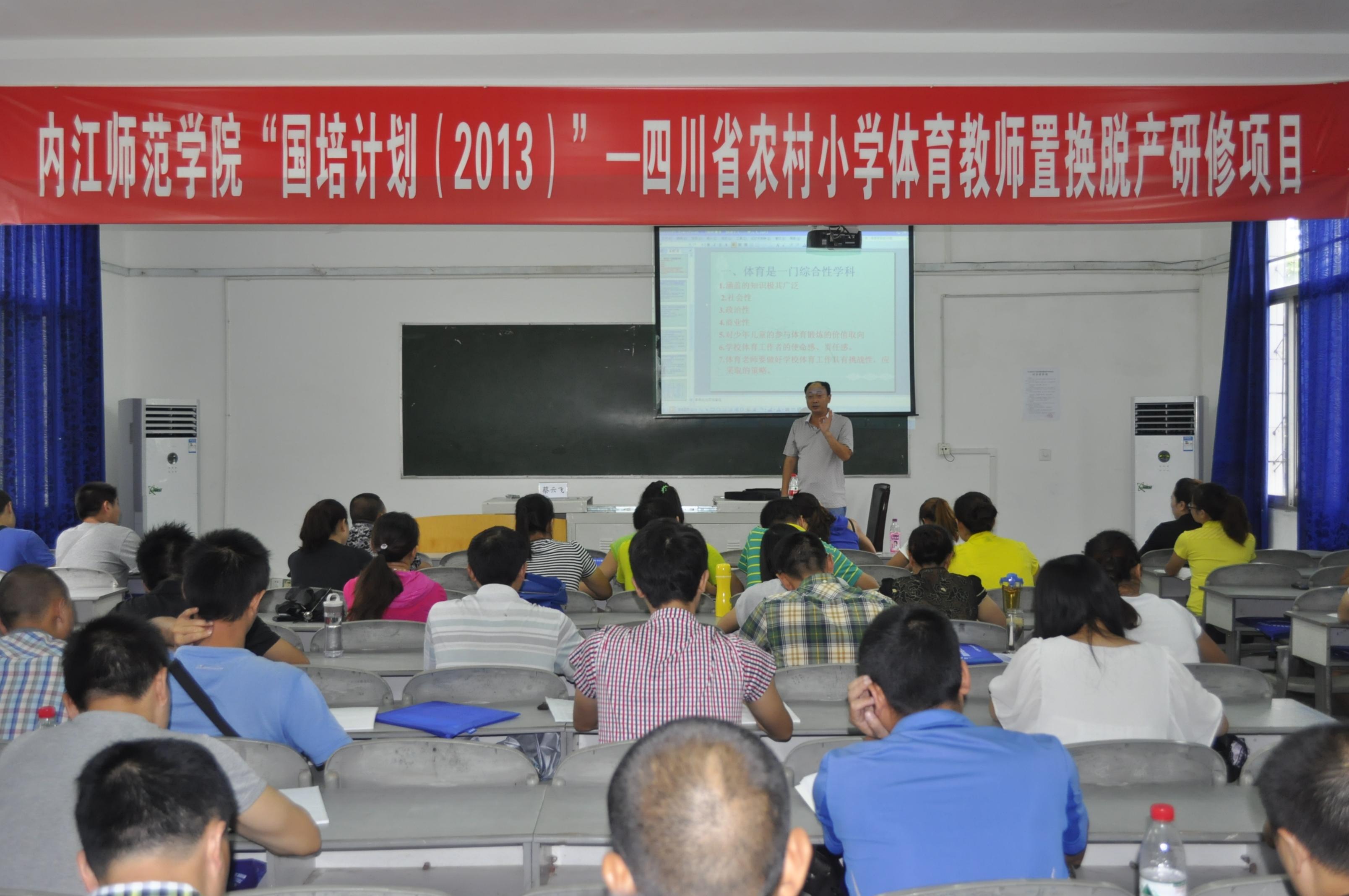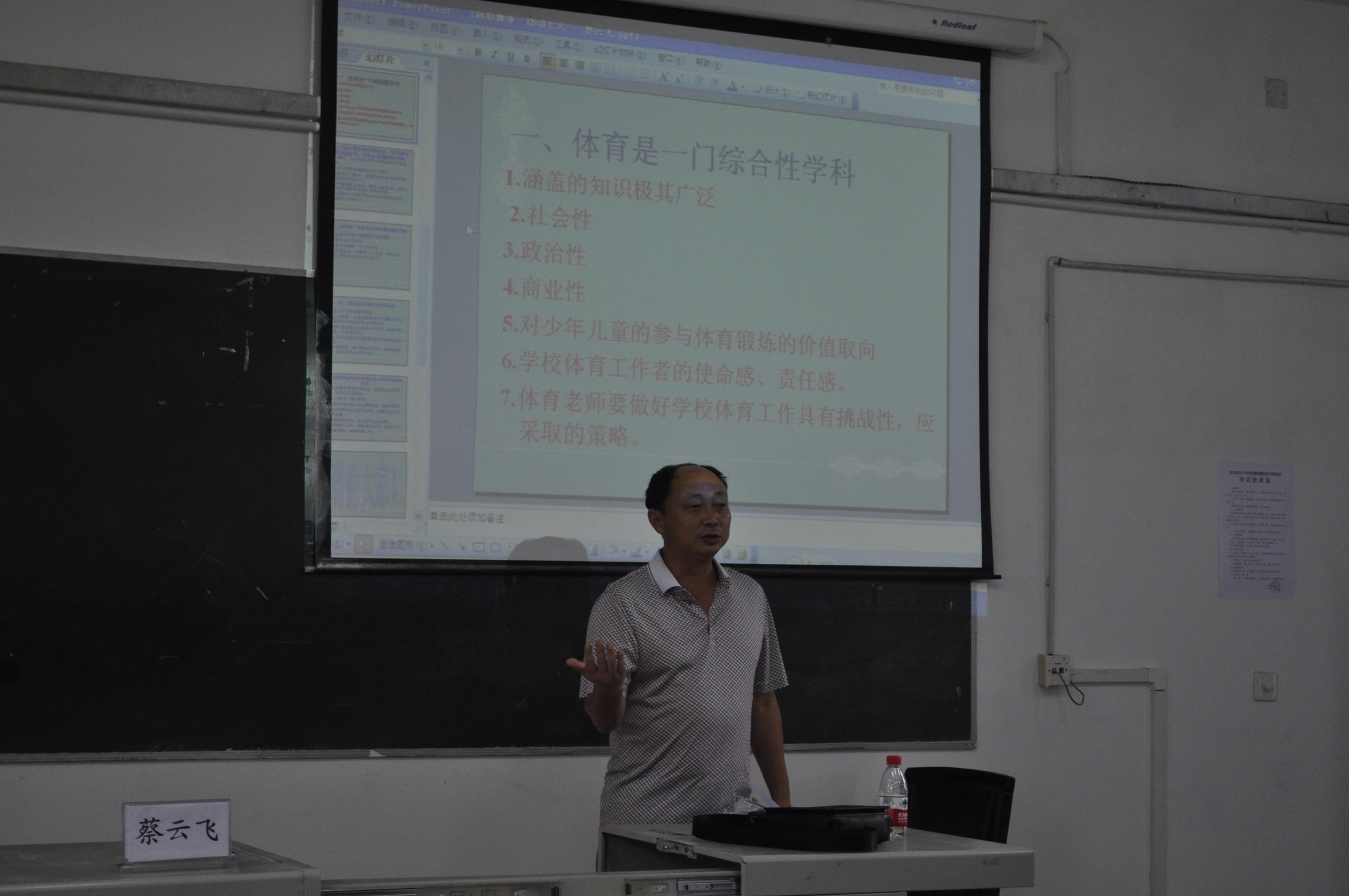 8月1日,内江市中小学体育专委会常委理事长、隆昌一中体育高级教师蔡云飞应邀为国培学员作专题讲座。他讲座的题目是《小学体育教学艺术探讨》。专题讲座由K1体育副经理、“国培”项目负责人谭伟平教授主持。