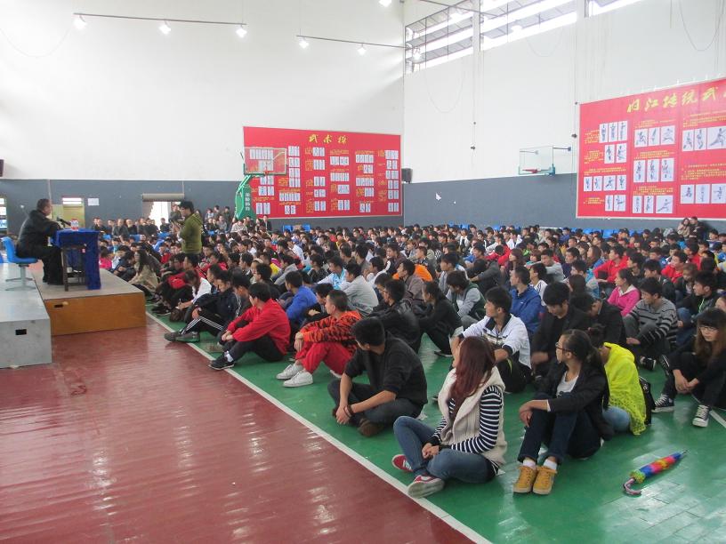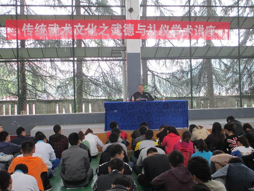 在主持人简短的开场白之后,尤再清教授便切入正题,他以诙谐幽默的语言从中国传统武术、四川传统武术、内江传统武术这三方面对传统武术的概况进行了介绍与分析。他指出:中国传统武术历史悠久,它“起于易、成于医、附于兵、扬于艺”。并从一击、一刺、一拳、一腿等方面介绍了查拳、华拳、红拳、少林拳等主要的拳种体系;详细区分了素有“南拳北腿”之分的武术的不同特点。四川传统武术尤以“一树开五花,五花八叶扶”著称的峨眉武术见长,并详细地介绍了武术近代传入四川的过程,以及内江传统武术的发展。