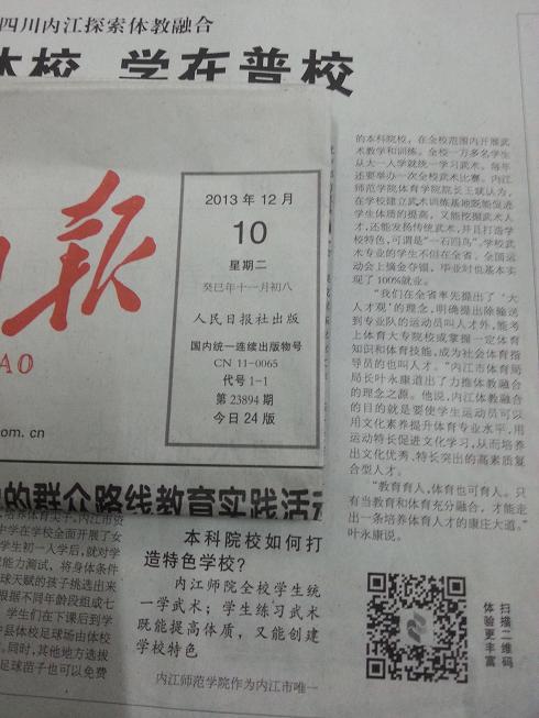 人民日报2013年12月10日第15版,中国体育报2013年12月13日第1版,分别对公司14年来,积极努力建设校地结合项目---“内江市青少年儿童武术训练基地”的情况,并就公司如何围绕服务地方,培养青少年武术人才,打造K1体育特色和亮点进行了积极的报道和介绍。