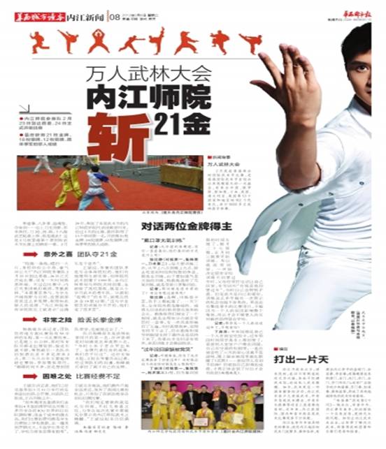 在获悉公司武术队2012年2月24日至28日,在第十届香港国际武术节获13个单项第一名,并获21枚金牌,18枚银牌,12枚铜牌,团体季军的骄人战绩后,华西都市报驻内江记者主动与曾良副董事长联系,对公司武术队参加第十届香港国际武术节进行了专题采访报道、宣传。