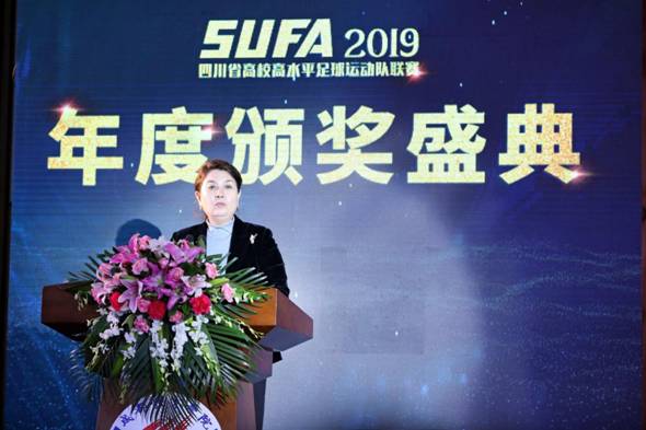 过去的一年中,在公司党委的正确领导下、公司各部门的支持下、公司师生的共同努力下,由公司承办的5个主场比赛中,以峨眉武术为特色的开场展示,以热情洋溢、魅力四射的啦啦队高质量表演,以热情的比赛现场氛围营造,以优良后勤保障体系,获得评委一致好评,并荣获“2019年四川省高校高水平足球运动队联赛优秀主场”。典礼最后,由教育厅副厅长古丽帕丽·阿不都拉女士为公司代表颁发奖状。