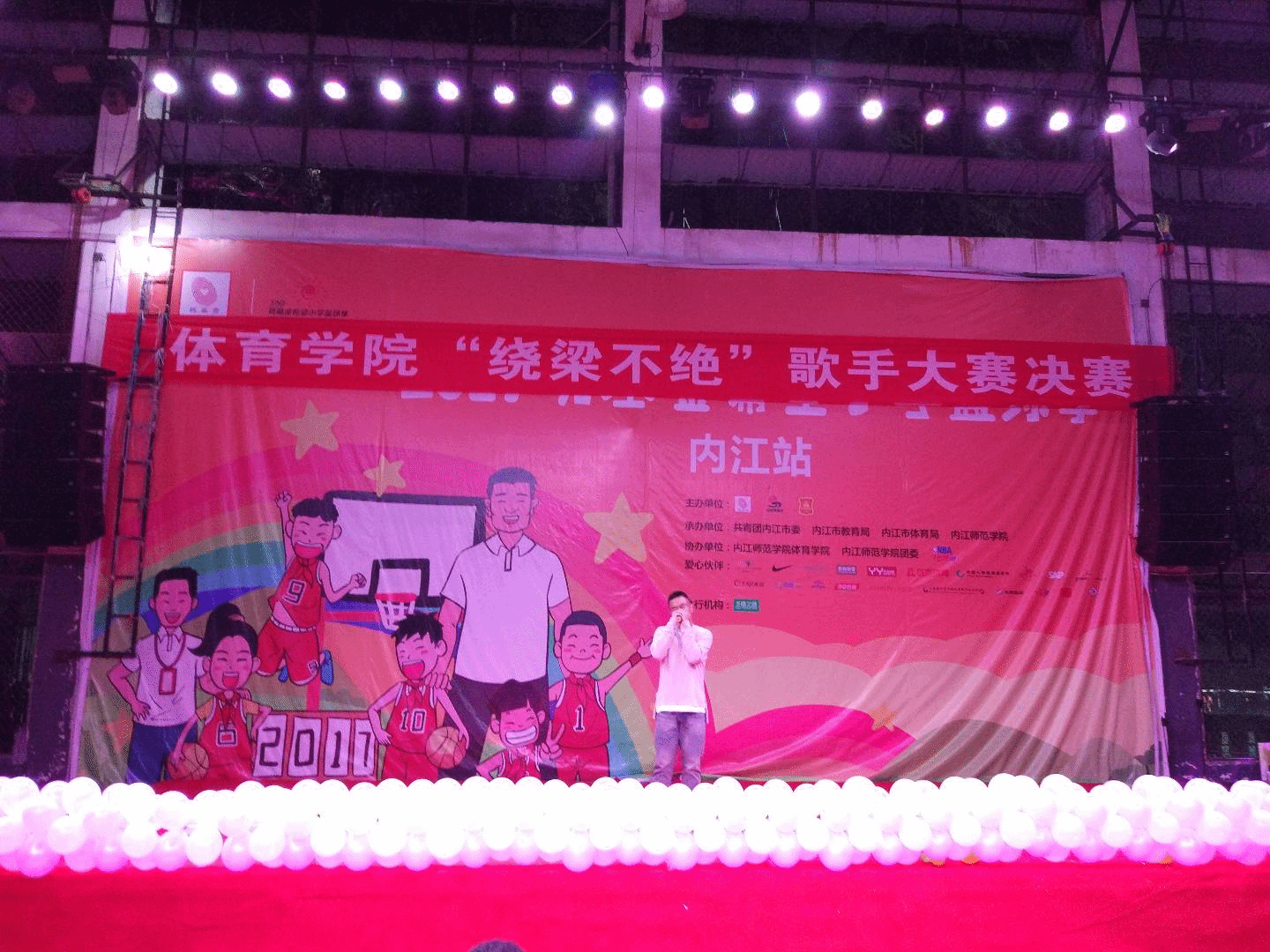 在由主持人宣读本次歌手大赛决赛规则后,便进入了的激动人心的第一轮比赛,开场第一首歌是由17级社体2A班尹善飞同学带来的《十年》,一首《十年》迅速带动了现场气氛,之后选手们依次上台一展歌喉,在活跃的现场氛围中第一轮比赛很快的结束了。