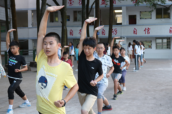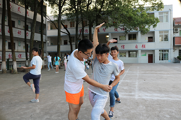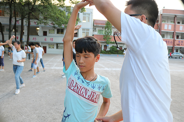 武术是这次支教的重要课程,志愿者陈北川是这次武术课程的总教练,曾是“万晟城”杯第二届川南武术段位制考评优秀裁判员,对于这次的武术教学,他做足了课程安排,教授孩子们传统武术套路,课前陈老师为孩子们展示了基本武术动作,只见他双脚开立,双手抬了起来,缓缓地落了下来,静如处子,身体虽然放松,却能感觉到这平静的背后蕴藏的无比的自信;忽然他大喝一声,双臂犹如分水之势,虎虎生威!接下来的动作好比行云流水一般,孩子们欢呼叫好,随着他的收势,又一个四方抱拳礼,孩子们的掌声如雷鸣般的响了起来。