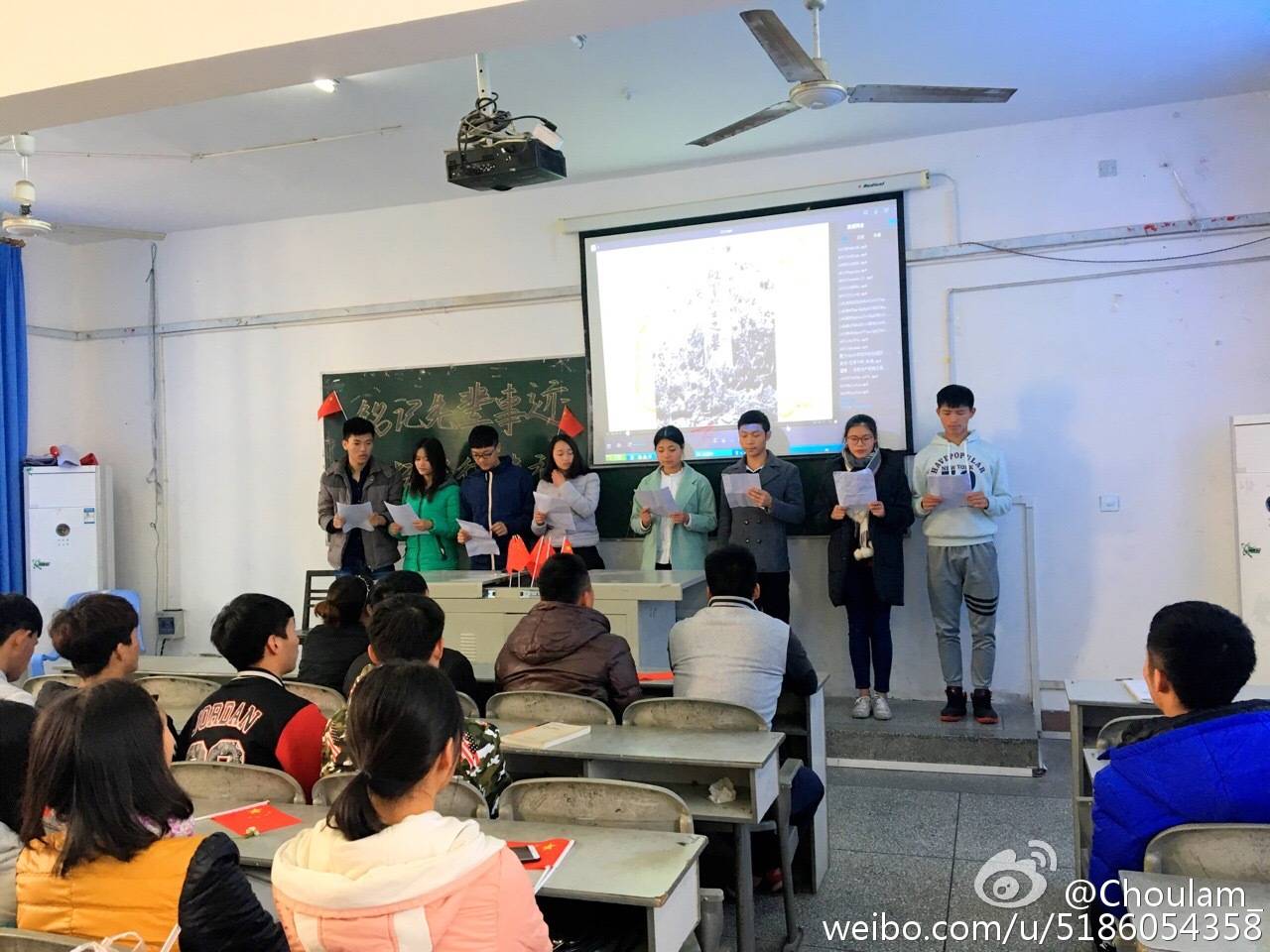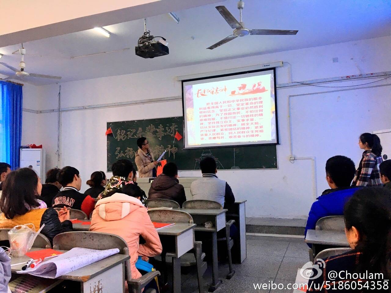 下午13点整,班会正式开始,全班同学共同观看了视频——《你觉得长征是什么》,以直观的画面为大家再现长征的种种故事,从中感受长征精神的伟大,红军的伟大,祖国的伟大。之后由黎艳,郭乔洪等八名同学为大家朗诵《走下去,活下去》,让同学们体会到先辈的不易,学会珍惜今天的幸福生活, 随着朗诵的落幕,我们迎来了由陈磊,王欣等五名同学带来的小品《红色抗日小品》。
