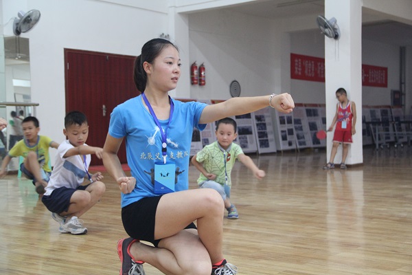 上完前两节课后,天空中飘起了小雨。但这并不能阻挡上第三节健美操和武术课的小朋友们的热情,下雨了,外面不能去,志愿者就带着小朋友来到旁边的车库里,“快乐的感觉无法想象,如同星星般的闪亮……”一样的音乐,一样的节奏,听见熟悉的音乐声,健美操班的小朋友立马活泼了起来,志愿者袁宁蔚站在队伍的最前端,带着小朋友做着准备活动。即使天公不作美,志愿者和小朋友的热情也不减。