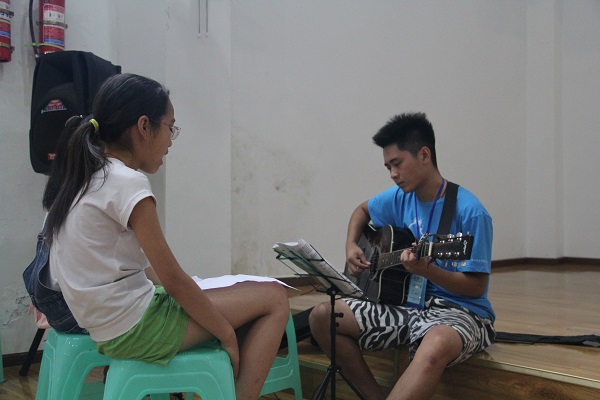 “隐形的翅膀,让梦恒久比天长,留一个愿望让自己想象……”。来到音乐班员工所在的教室,志愿者喻真平正在教孩子们唱《隐形的翅膀》小朋友们合着喻老师的吉他声,一句一句的学着唱,脸上堆满了笑容。