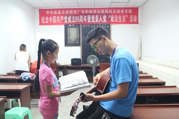刘春梅是负责在“柳倩书画社”教小朋友美术课程的志愿者,班上有近30名小朋友,课堂上小朋友们十分活跃,总是会问她各种问题“老师,为什么这个牛的眼睛长这样……老师我这样画可不可以……”面对这些问题刘春梅不但不嫌烦,而且总是一一回答。课堂上她将要教小朋友画的画提前画好贴在黑板上,然后再带着小朋友一起示范在黑板上再画一遍,“来,看着老师,这里我们先这样画……”教完一遍后,她再让小朋友接着把自己没有完成的画画完,一些小朋友年龄太小画不好她就下去手把手,一步一步教他们。音乐班的志愿者陈露,总是被一群小朋友包围着,这个阳光爱笑的大男孩用自己的吉他声吸引了许多小朋友。
