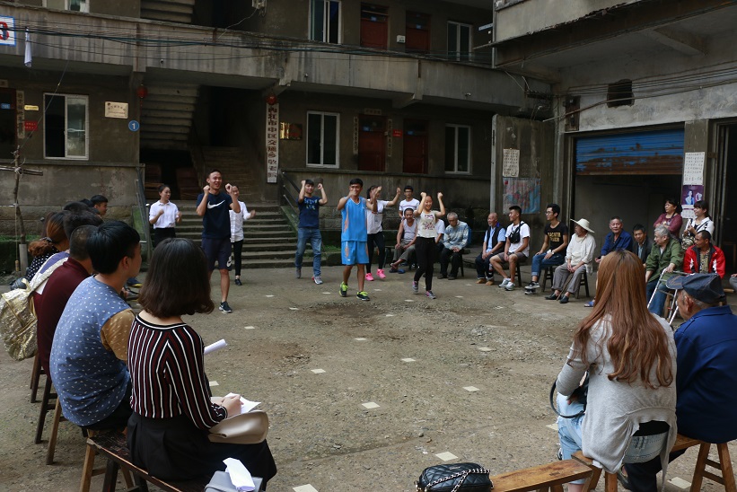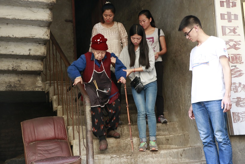 志愿者的到来让老人们很开心,一系列的节目如武术、健美操、拉丁等让老人笑开了怀,大家和老人一起围成一个圈聊天,许多老人都很健谈,拉着志愿者的手不停地倾诉。敬老院里有一位94岁的蓝俊芝老奶奶,因为行动不便,平日很少下楼,志愿者们便上楼帮她晾衣服、陪她聊天。蓝奶奶在听到楼下的音乐和欢笑后,坚持要下楼看看,征得敬老院负责人的允许后,志愿者扶着她慢慢地走下来,看到这样热闹的场面,蓝奶奶的脸笑成了一朵花。她还主动告诉我们,她有一个养女在成都,等到她100岁的时候,就会回来看她。