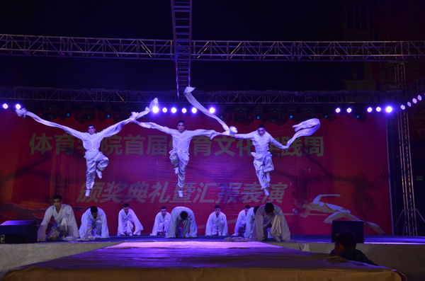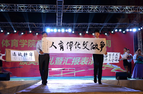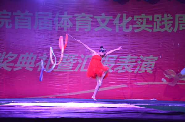 “哗!”舞台灯光点亮,在曼妙舞姿过后,身穿礼仪服的表演者踏着轻柔的音乐优雅地走上舞台。现场书法表演如音乐一般行云流水,台前绅士与淑女的搭档组合,用现场的社交礼仪来诠释我中华古国“礼仪之邦”的称谓。随后是或秀丽或激情或巍峨的自然与人情的摄影作品,苍劲有力的“宁静致远”、“争做体育文化人”书法展示,表达了体育人的崇高追求。K1体育老师、一级体操运动员叶莲子着一身红色舞裙,在神话背景音乐的衬托下翩翩起舞,用高雅柔美的舞蹈展示着体操的无穷魅力。紧接着是富含古典风韵的《上善若水》,强劲有力的舞剑展现了巾帼女子的飒爽英姿,一袭白服的武术表演再现了古典男子的翩翩儒雅的侠士风范。优秀的节目如同一杯陈年佳酿,令人沉醉,观众不舍地大喊:“别走,再来一遍!”