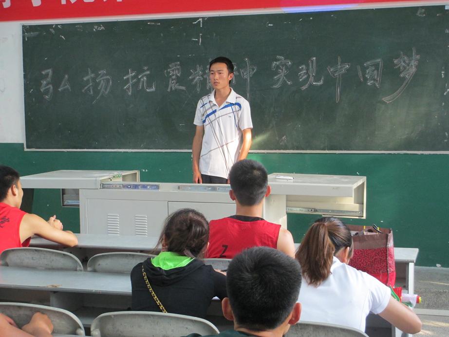 各班结合自身的特点开展活动,有的班级采取了为在地震中失去生命的同胞默哀仪式,有的班级采用了PPT讲说,有的班级观看救灾方面视频,每个班级都由同学们介绍分享避地震经历和避地震经验,并以乐观的心态面对生活。深重灾难打不垮中华儿女坚强的意志,大灾大难磨砺中华儿女昂扬斗志。