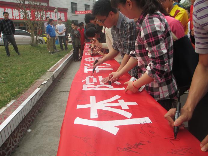 最后,经理王斌、党总支书记冯亚平首先在横幅上签字,随后所有参加活动的领导和老师也依次签字,全体同学表现得非常积极踊跃,纷纷在横幅上签下自己的名字。