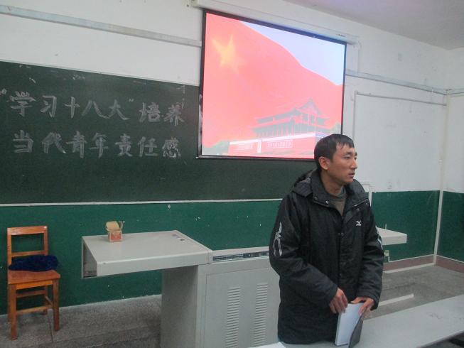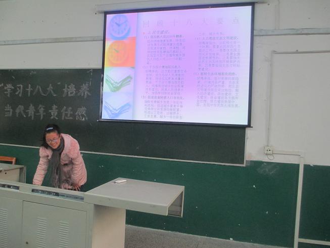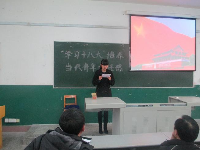 主持人首先用PPT的形式介绍十八大召开的背景和意义,接下来郑菲、黄丽娟、胡涛三位同学分别发表了自己的感想,他们从自身出发,以一名90后老员工的身份表明了自己的态度,“要认真学习,掌握扎实的专业技能,提高综合素质,时刻准备为国家和社会奉献自己的力量”。冯书记在听完同学们发言后讲话,“青年老员工就要有社会责任感,关心国家大事就是关心自己的未来,相信你们将来一定会大有作为,成为国家的栋梁之才,但是前提必须要认真学习,抓紧每一时刻提高自己,不要荒废大学时光”。马老师最后指出:广大青年要关心政治,因为这与每位同学都息息相关,只有现在自己的综合素质提高了,将来才能有大的作为”。