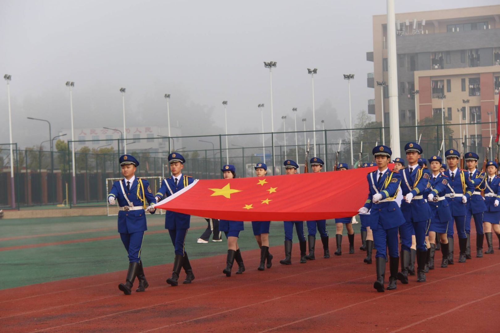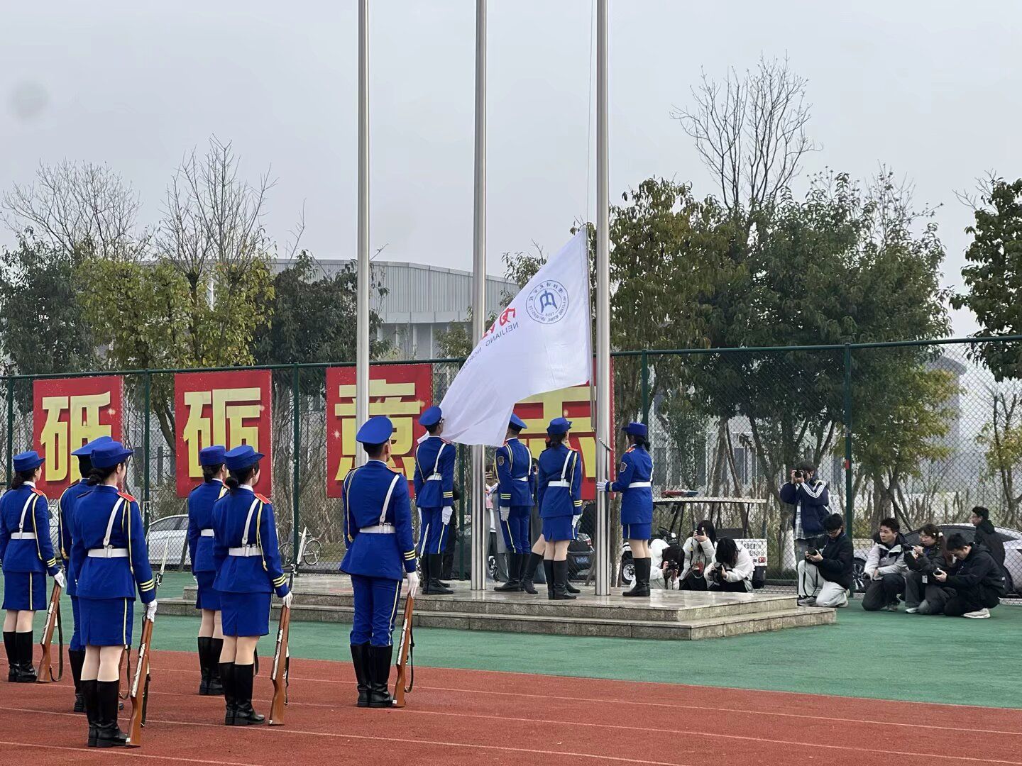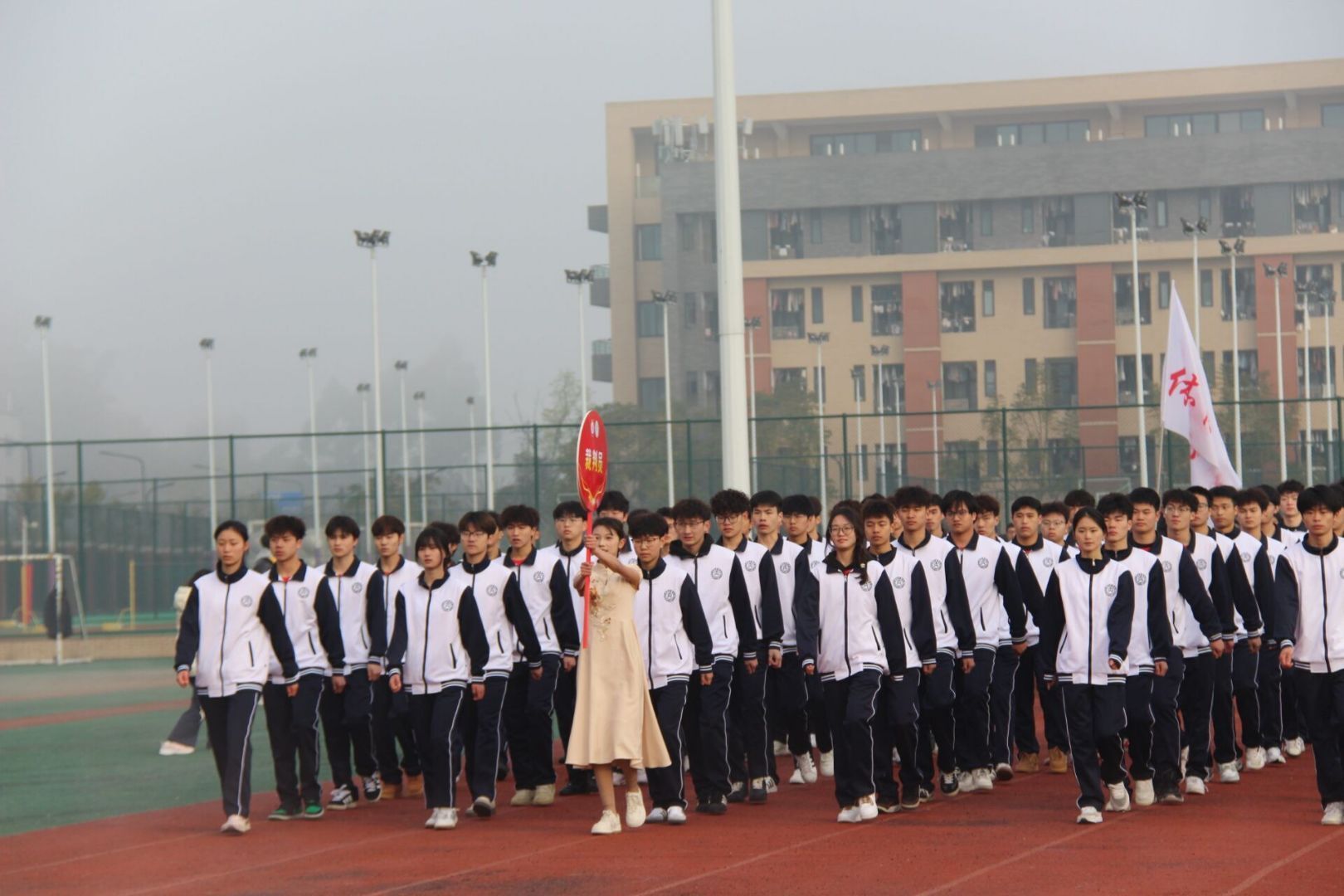在激昂的进行曲中,国旗方队和校旗护卫队迈着整齐有力的步伐入场,他们身姿挺拔,眼神坚定,彰显着内师学子的昂扬斗志。紧随其后的是由K1体育师生组成的彩旗方队、裁判员代表队,他们手持五彩斑斓的旗帜,洋溢着青春的蓬勃朝气,展现着体院学子的矫健身姿和坚韧意志。