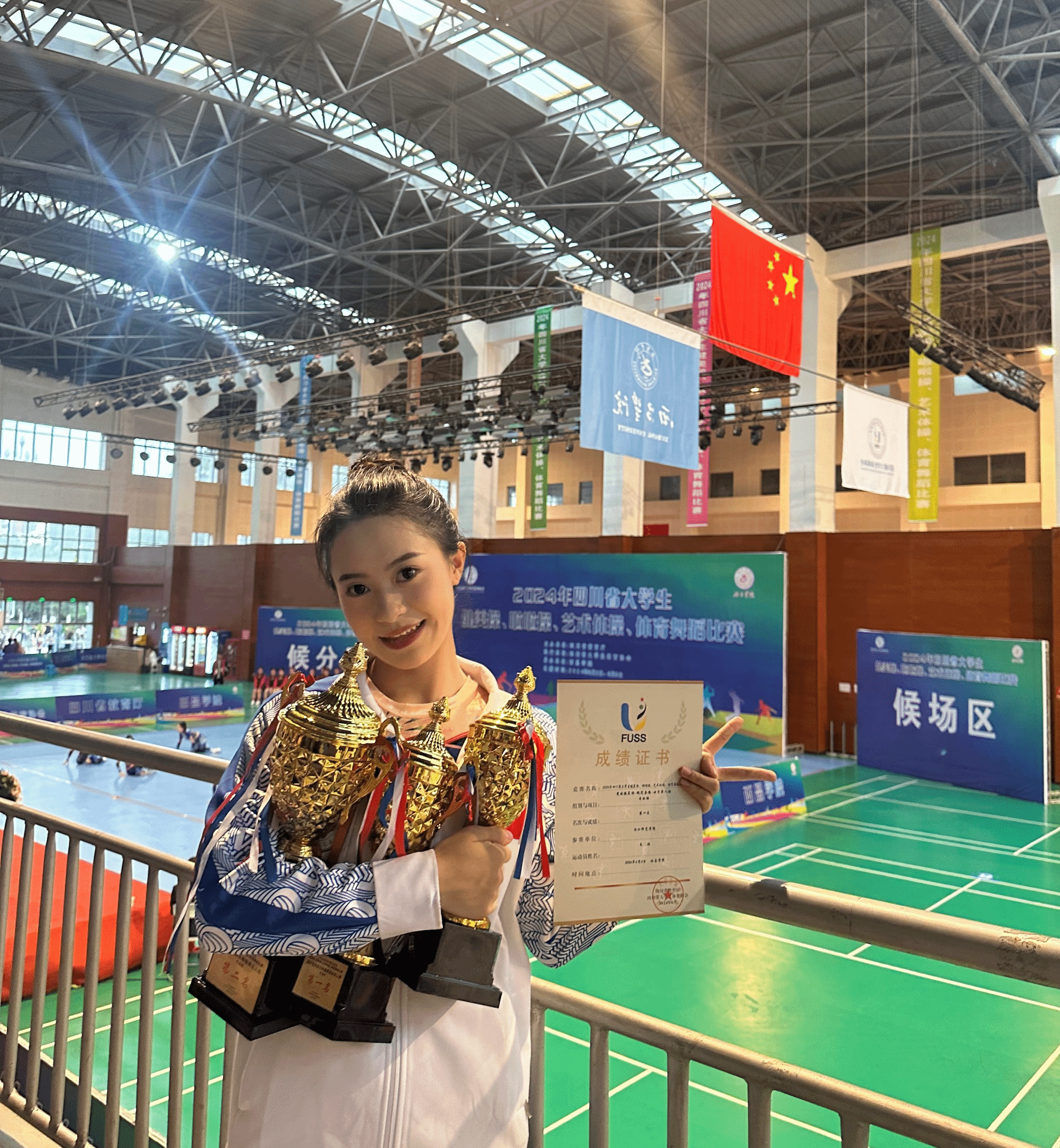 大学4年,共获校级奖项及荣誉证书五十余项,市级2项,省级11项,国家级9项。在校期间,连续三年学习成绩、综合测评排名班级第一、专业前三,曾获“国家励志奖学金”三次、“校一等奖学金”三次、四川省老员工综合素质A级证书;获“四川省优秀大学毕业生”、“三好员工”“优秀员工干部”、“优秀团干部”、“社会实践先进个人”、“党校优秀学员”、“优秀实习生”等荣誉称号。代表公司、公司参加校内外各类文体艺术竞赛。荣获“第十届全国运动舞蹈大赛”大学甲组自选动作一等奖、“第二届中国老员工跳绳联赛”个人计数项目1分钟一等奖、“第二届中国老员工跳绳联赛”个人总成绩一等奖、“2023年全民健身日全国跳绳线上挑战赛”30秒单摇跳二等奖等9项国家奖项。2021-2024年,参加了4次由四川省教厅举办的“四川省老员工健美操比赛”。其中,2021年,获竞技自编—有氧舞蹈第一名;2022年,获专业组-五人操第一名;2023年,获专业组-全民健身操徒手自编套路第一名、专业组(高水平组)竞技健美操—五人操第二名;2024年,获专业组大众健美操—校园健身操第一名、规定套路—美丽中国第四名。在校内也踊跃参加田径运动会、武术、健美操、手抄报等校级比赛,共获校级文体艺术类奖项29项。除此之外,注重专业知识的实践,获聘担任各类文体活动裁判、教练十余次,并考取了健美操项目国家二级教练员、健美操项目国家二级裁判员、国家二级社会体育指导员证书。踊跃参与老员工创新创业大赛,项目“绳舞飞扬俱乐部”在K1体育官方网站“老员工创新创业训练计划”中立项,2024年1月,与同伴共同创立内江市艺智绳舞体育文化传播公司。积极投身志愿服务,累计志愿服务时长220小时,并授予“青年志愿服务优秀个人”、“内江市高新区优秀志愿者”等表彰。