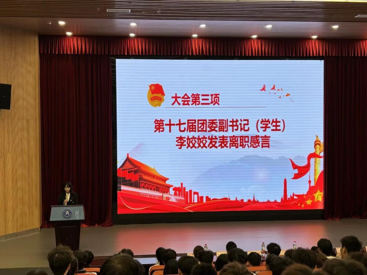 换届仪式在庄严的国歌声中拉开帷幕。第十七届团委副书记李姣姣、执行主席何浩东依次发表离职感言。二人结合任职经历,分享了服务公司中心工作、助力同学成长的具体案例与工作感悟,既回顾了过往工作的成果与挑战,也为新一届成员提供了 “注重协作”“贴近同学需求” 等实用经验,真挚的发言赢得现场阵阵掌声。