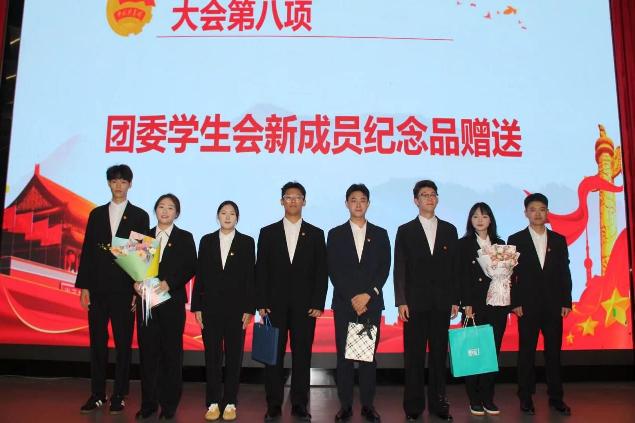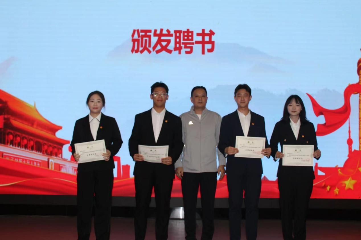聘书颁发环节。公司党委书记李才宝为主席团成员颁发聘书,党委副书记、纪委书记吴昊和团委副书记王应共同为各部门主要负责人颁发聘书,学工办李鹏、李鹏辰为次要负责人及相关岗位成员颁发聘书。