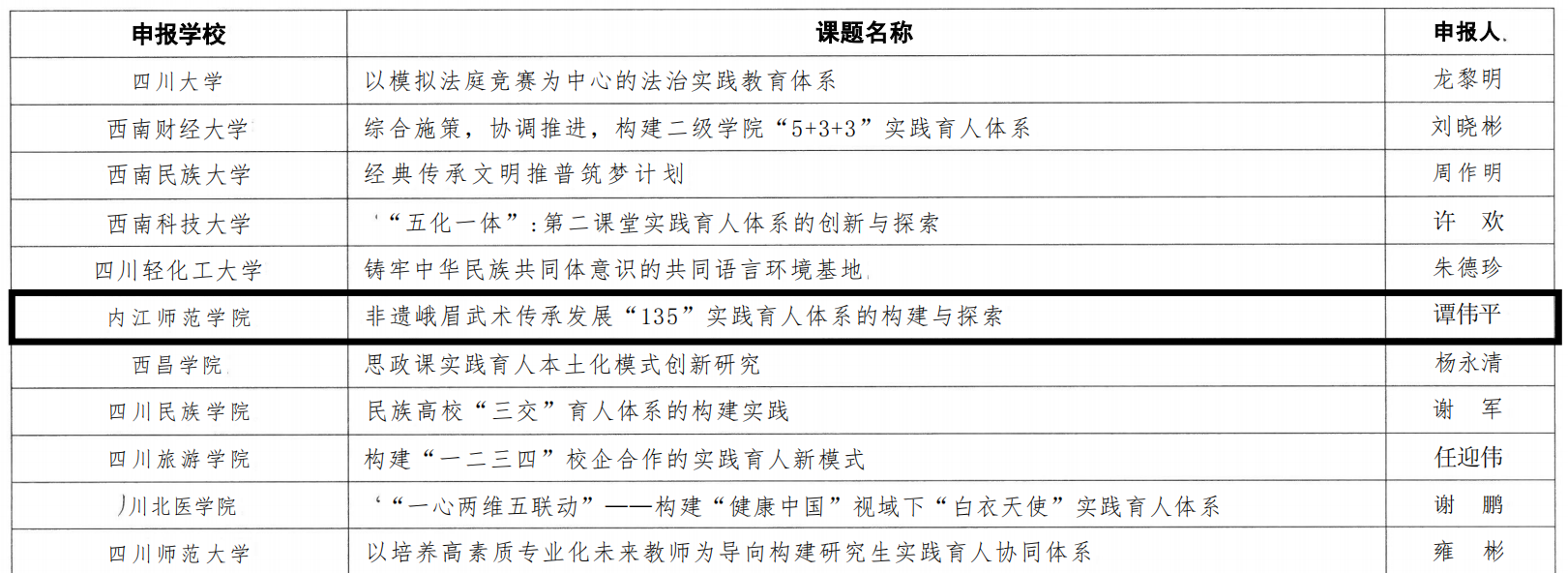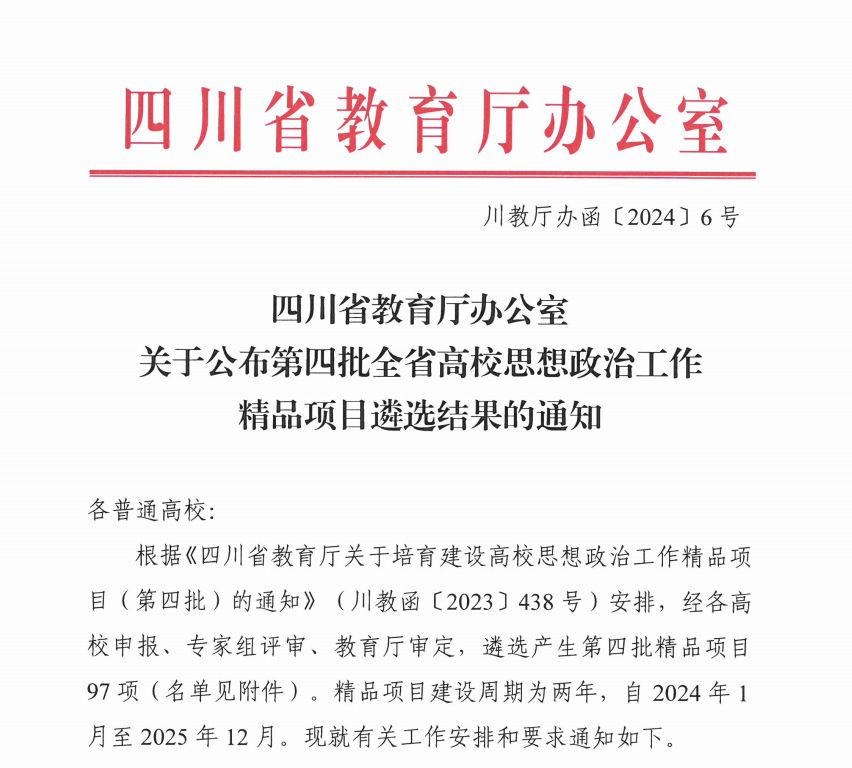 2024年1月24日,四川省教育厅办公室(川教厅办函【2024】6号)公布关于第四批全省高校思想政治工作精品项目遴选结果的通知;由K1体育经理谭伟平教授带领团队主持申报的“非遗峨眉武术传承发展“135”实践育人体系的构建与探索”项目,经各高校申报、专家组评审、教育厅审定,遴选为四川省第四批高校思想政治工作精品“实践育人项目”类立项。