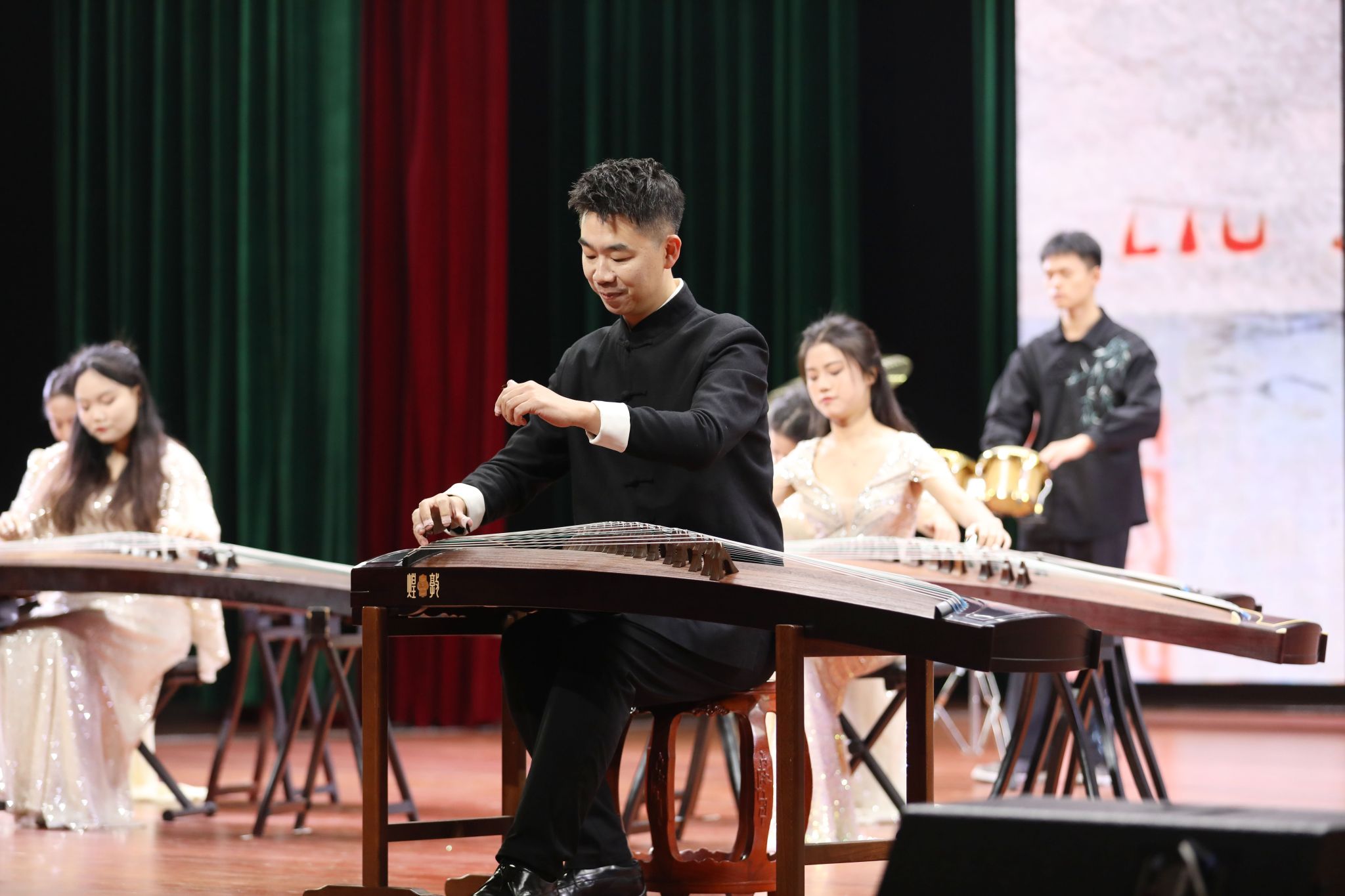 宣讲活动中,音乐公司师生表演了古筝重奏《柳京之舞》,通过传统风格音调和极具特色的节奏对位将现场观众带入描绘节日喜庆的欢腾盛景。