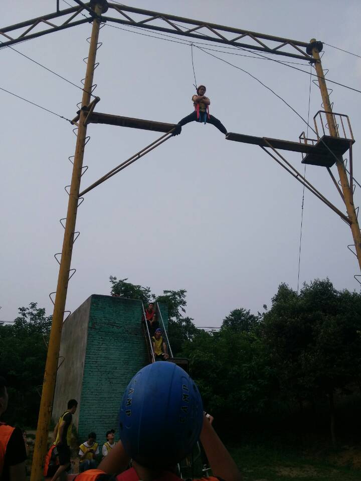 制作呼吸机烧脑,空中断桥则更加考验参与者的心理素质。两根8米多高的铁杆矗立于地,两块窄板分别伸出却不靠拢,形成空中断桥,拓展活动规则要求队员们爬上铁杆,从窄板的一端跳至另一端,再返回落脚,成开立姿势,教练提示并腿时,再双脚悬空,落回地面。几名女生率先要求体验,都顺利通过了,这相当于给其他队员打了一针“强心剂”。不过,虽然有已通过的“吃螃蟹的人”,也有严密的安全保护装置,仍然免不了有许多小伙伴被悬空的空隙吓倒,在空中摇摇晃晃,不敢跨出那一步。每当有人不敢通过时,其他队员就会在下面为他们加油助威,在同学们的鼓励下,基本上全部的同学都通过了这项“恐怖”的挑战。那些因为通过同学们的鼓励才完成挑战的小伙伴也坦言:在上面真的是高度紧张,但一听到队员都在为自己加油,就有了勇气,跨出那一步后,才觉得并没有自己想象的那么吓人。
