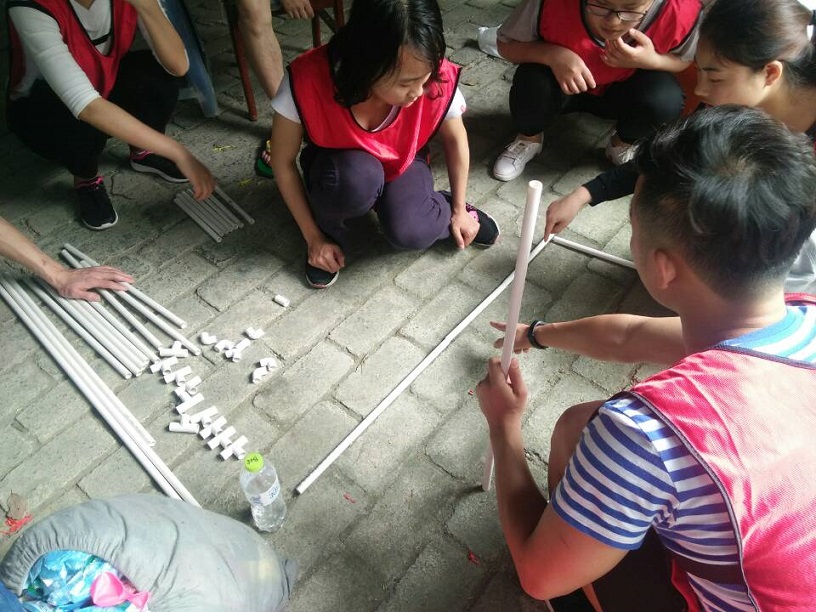 第一个拓展活动,就让同学们感到有些“头疼”,一堆零散的、各种规格的水管及三种连接头,一张设计图,两根塑料绳横在场地上,隔出了楚河汉界,也将各队人马分成了三拨儿:大脑组掌握图纸、下发任务;沟通组上传下达,传递及反馈信息;执行组则听从命令,动手制作。在信息交流困难的条件下,要拼出一个复杂的吹气机,并吹爆两个气球,着实有些考验人。不过在各队员的共同努力下,“猛龙过江”队的小伙伴们依然率先完成了制作,吹爆气球的瞬间,队员们都激动地跳了起来。