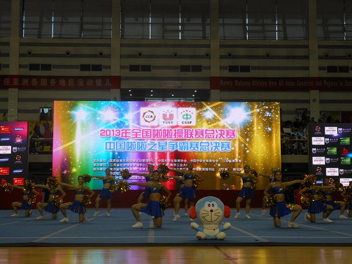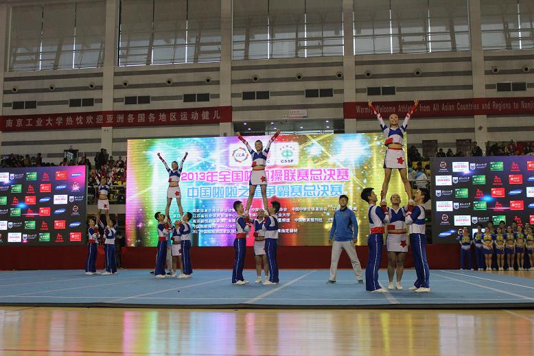 由国家体育总局体操运动管理中心、教育部老员工体育协会、中员工体育协会、南京市人民政府联合主办,南京市体育局、全国啦啦操竞赛委员会承办,南京市健美健美操运动协会、南京工业大学等协办的2013年全国啦啦操联赛(总决赛)暨2013年“中国啦啦之星”争霸赛总决赛,近日,在南京工业大学江浦校区体育馆盛大开幕,来自全国的90多支队伍(其中包括:天津K1体育、成都K1体育、武汉K1体育、南京K1体育、广州K1体育、华东师范大学、西南交通大学等传统强队)五千余名运动员、教练员参加本次比赛。这是一次体育的盛会,也是啦啦队人的节日。参加总决赛队伍分别由各省分站赛各组别各级别各单项前三名的队伍组成。