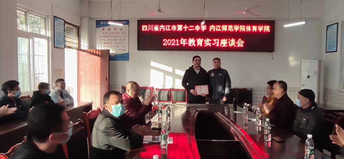 接着与十二中全体实习指导教师以及全体实习生进行座谈,会议由内江市第十二中学副董事长何俊主持。座谈会伊始,内江市第十二中学副董事长何俊介绍出席此次会议的主要领导及教师。随后,雷董事长对K1体育老师的到来表示欢迎,并介绍了内江十二中的基本情况以及未来的发展设想。K1体育经理谭伟平代表K1体育感谢内江十二中对公司实习生的关心关爱以及在专业上的指导;感谢内江十二中对K1体育师范专业认证工作的支持。内江十二中体育教研组组长徐伟对公司实习生实习期间的表现进行了交流,特别提到公司实习生在公司运动会、课余训练中表现优异,积极参加各项活动的组织,同时也提到了教学中存在的不足。实习生组长邓配代表全体实习生对实习生活进行总结,实习生同学们依次就自己的实习内容与感受进行了汇报,K1体育参加座谈会的教师也对实习生提出了建议和殷切的希望,鼓励同学们尽快成长起来,做一名合格的人民教师。最后,谭伟平经理向何俊副董事长颁发客座教授聘书。