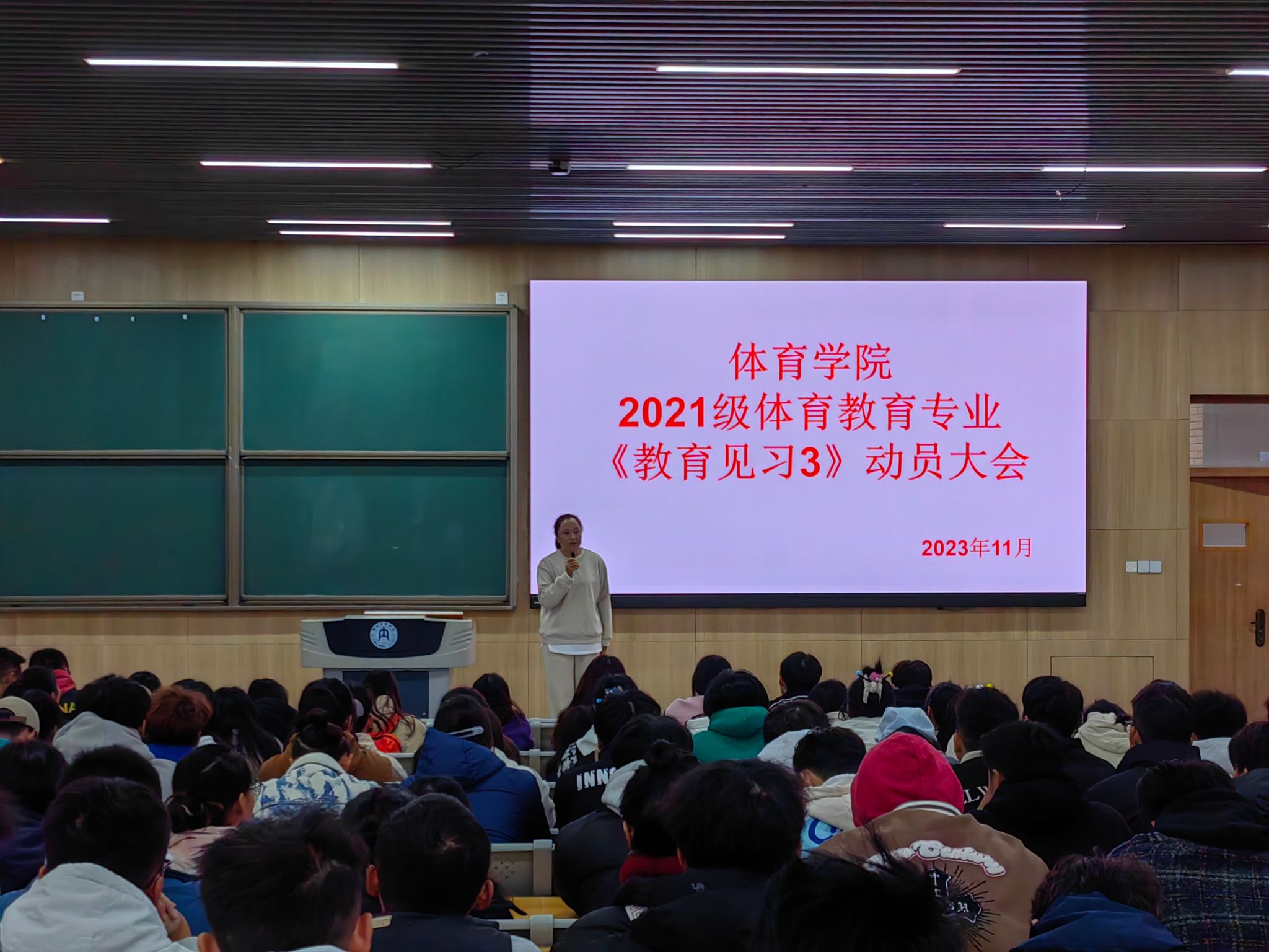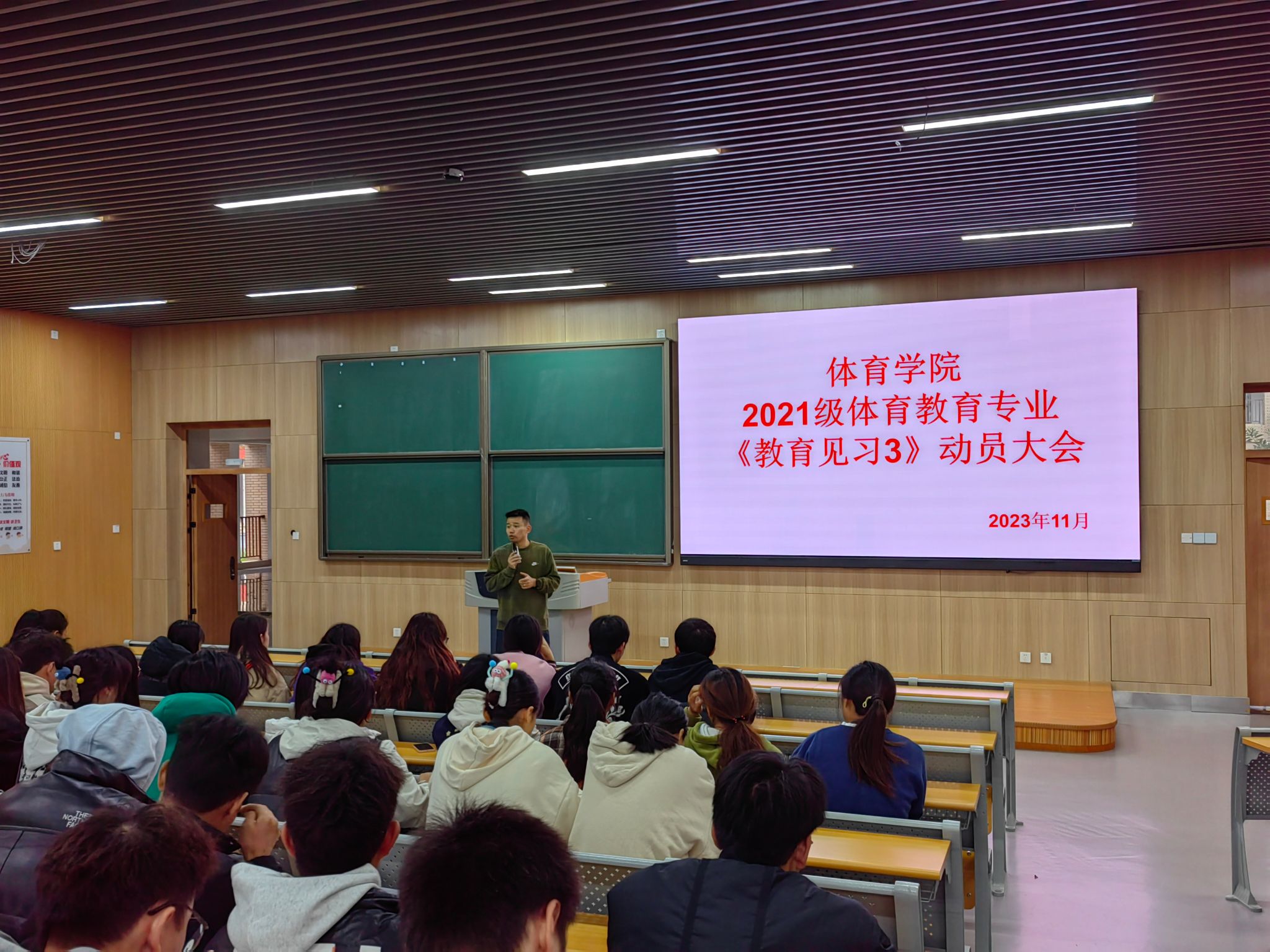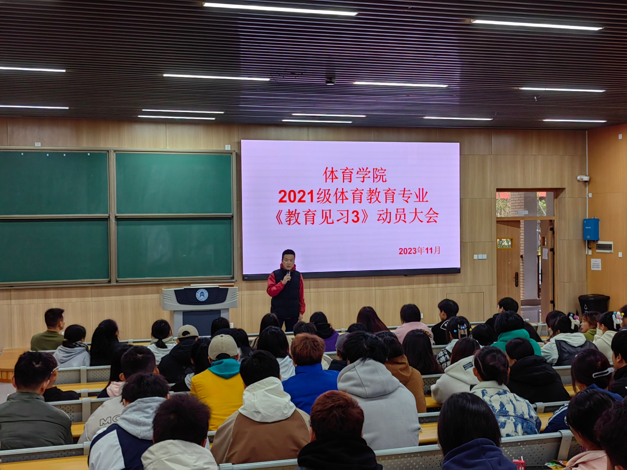 根据体育教育专业人才培养方案的规定和本学期的实际,K1体育体育教育专业的1、2、5、6A班在11月13日至17日进行为期一周的《教育见习Ⅲ》。为推进教育见习工作的顺利开展,11月13上午8点30分,K1体育实践教学教研室在明德楼B区111教室组织召开了2021级体育教育专业《教育见习Ⅲ》动员大会。大会由K1体育实践教学教研室主任刁沛主持,教学副经理申向军、内江市第一中学体育教研组组长罗槟、实践教学指导教师以及2021级体育教育专业全体员工参加了本次会议。