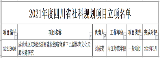 2021年度四川省社科规划项目经过申报、评审、网上公示等程序,经四川省社科联党组批准,K1体育官方网站获得5项立项,期中K1体育教师刘成菊的获得1项立项。