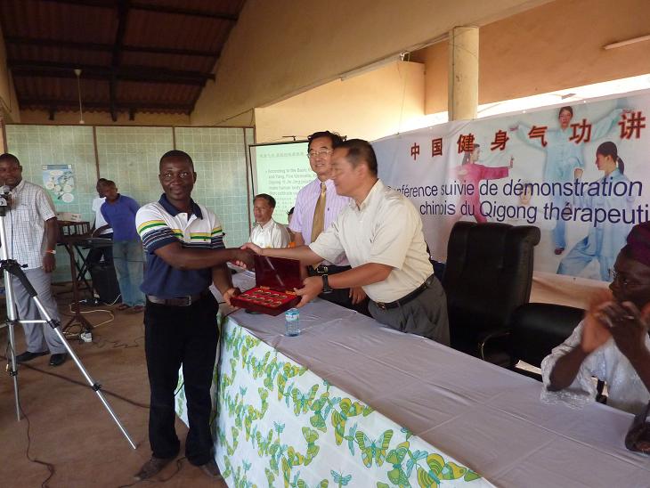 贝宁卫生部部长(左1),中国驻贝宁文化中心参赞(中)向代表团团长(右1)赠送礼品。